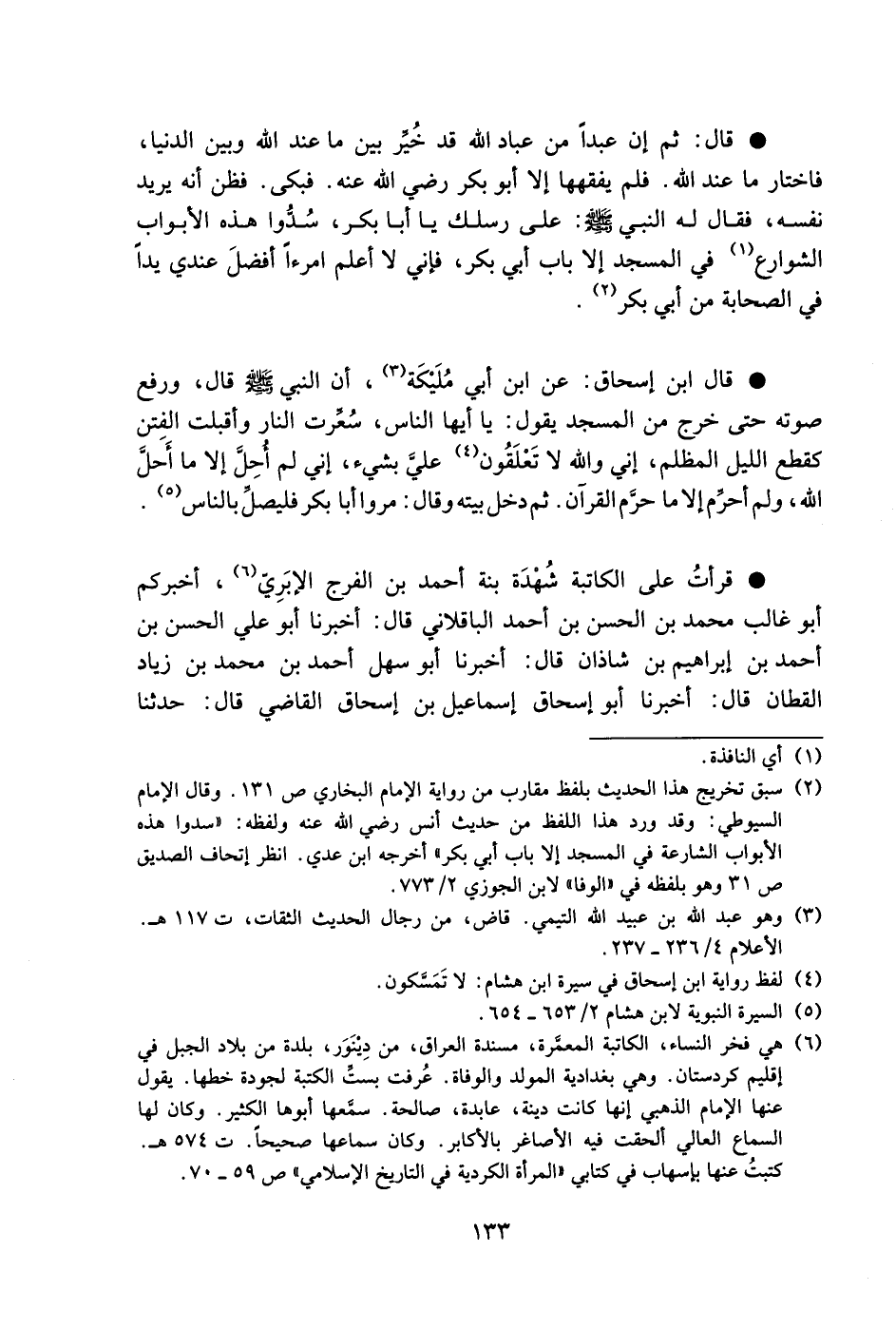 قَالَ: " ثُمَّ إِنَّ عَبْدًا مِنْ عِبَادِ اللَّهِ قَدْ خُيِّرَ بَيْنَ مَا عِنْدَ اللَّهِ وَبَيْنَ الدُّنْيَا، فَاخْتَارَ مَا عِنْدَ اللَّهِ، فَلَمْ يَفْقَهُهَا إِلا أَبُو بَكْرٍ رَضِيَ اللَّهُ عَنْهُ، فَبَكَى، فَظَنَّ أَنَّهُ يُرِيدُ نَفْسَهُ، فَقَالَ لَهُ النَّبِيُّ صَلَّى اللَّهُ عَلَيْهِ وَسَلَّمَ: عَلَى رِسْلِكَ يَا أَبَا بَكْرٍ، سُدُّوا هَذِهِ الأَبْوَابَ الشَّوَارِعَ فِي الْمَسْجِدِ إِلا بَابَ أَبِي بَكْرٍ، فَإِنِّي لا أَعْلَمُ امْرَءًا أَفْضَلَ عِنْدِي يَدًا فِي الصَّحَابَةِ مِنْ أَبِي بَكْرٍ " قَالَ ابْنُ إِسْحَاقَ: عَنِ ابْنِ أَبِي مُلَيْكَةَ، أَنَّ النَّبِيَّ صَلَّى اللَّهُ عَلَيْهِ وَسَلَّمَ، قَالَ وَرَفَعَ صَوْتَهُ حَتّى