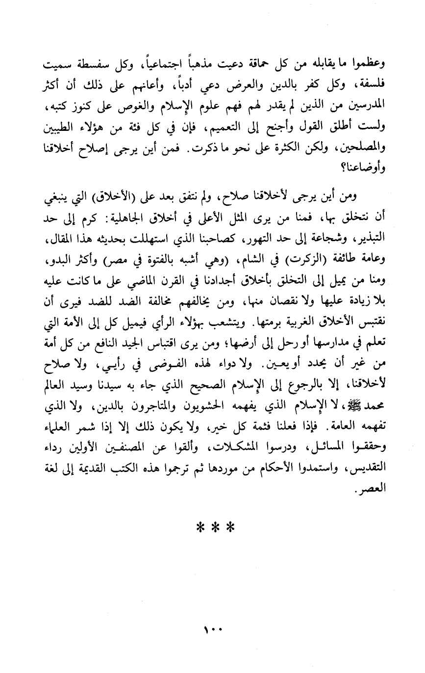 وعظموا ما يقابله من كل حماقة دعيت مذهباً اجتماعياً، وكل سفسطة سميت فلسفة، وكل كفر بالدين والعرض دعي أدباً، وأعانهم على ذلك أن أكثر المدرسين من الذين لم يقدر لهم فهم علوم الإسلام والغوص على كنوز كتبه، ولست أطلق القول وأجنح إلى التعميم، فإن في كل فئة من هؤلاء الطيبين والمصلحين، ولكن الكثرة على نحو ما ذكرت. فمن أين يرجى إصلاح أخلاقنا وأوضاعنا؟