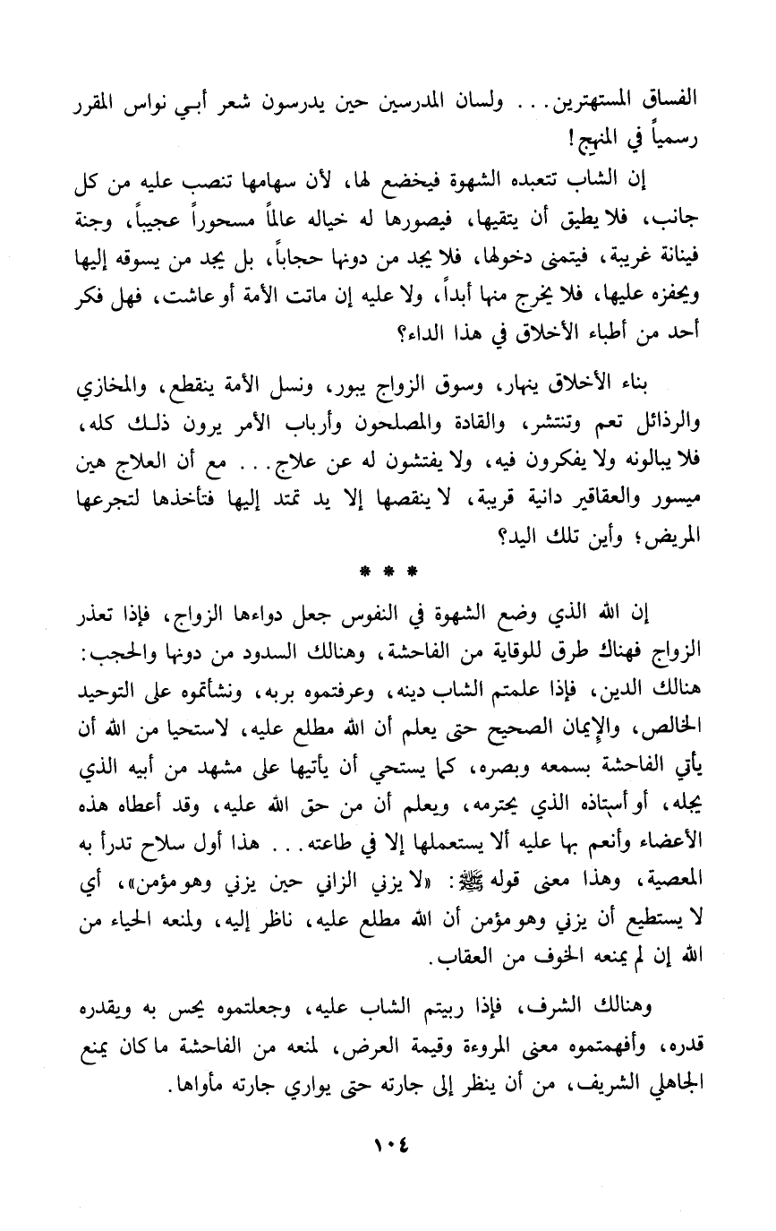 إن الله الذي وضع الشهوة في النفوس جعل دواءها الزواج، فإذا تعذر الزواج فهناك طرق للوقاية من الفاحشة، وهنالك السدود من دونها والحجب: هنالك الدين، فإذا علمتم الشاب دينه، وعرفتموه بربه، ونشأتموه على التوحيد الخالص، والإيمان الصحيح حتى يعلم أن الله مطلع عليه، لاستحيا من الله أن يأتي الفاحشة بسمعه وبصره، كما يستحي أن يأتيها على مشهد من أبيه الذي يجله، أو أستاذه الذي يحترمه، ويعلم أن من حق الله عليه، وقد أعطاه هذه الأعضاء وأنعم بها عليه ألا يستعملها إلا في طاعته ... هذا أول سلاح تدرأ به المعصية، وهذا معنى قوله صلى الله عليه وسلم: «لا يزني الزاني حين يزني وهو مؤمن»، أي لا يستطيع أن يزني وهو مؤمن أن الله مطلع عليه، ناظر إليه، ولمنعه الحياء من الله إن لم يمنعه الخوف من العقاب.