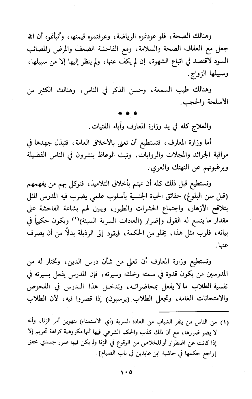 وهنالك الصحة، فلو عودتموه الرياضة، وعرفتموه قيمتها، وأنبأتموه أن الله جعل مع العفاف الصحة والسلامة، ومع الفاحشة الضعف والمرض والمصائب السود لاقتصد في اتباع الشهوة، إن لم يكف عنها، ولم ينظر إليها إلا من سبيلها، وسبيلها الزواج.