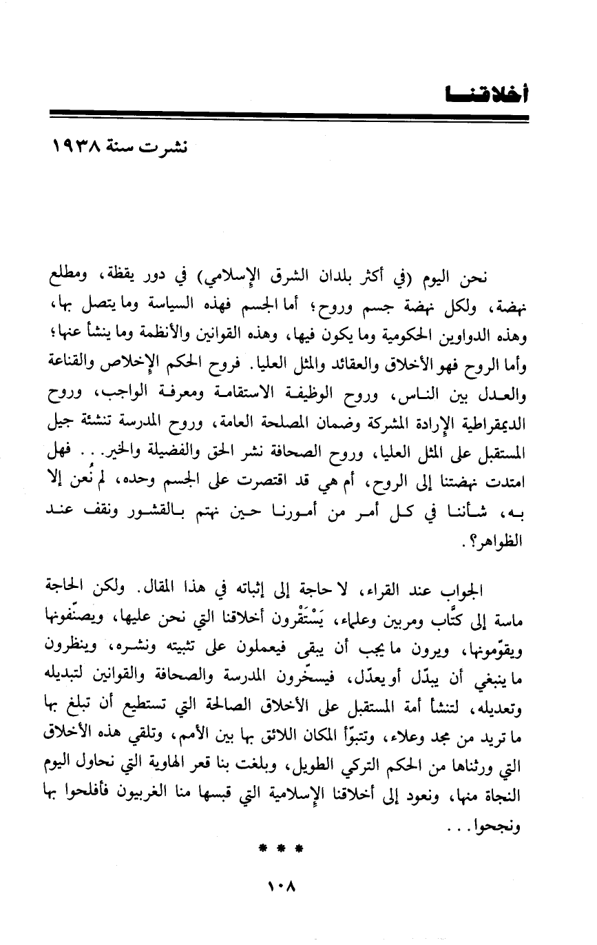 نحن اليوم (في أكثر بلدان الشرق الإسلامي) في دور يقظة، ومطلع نهضة، ولكل نهضة جسم وروح؛ أما الجسم فهذه السياسة وما يتصل بها، وهذه الدواوين الحكومية وما يكون فيها، وهذه القوانين والأنظمة وما ينشأ عنها؛ وأما الروح فهو الأخلاق والعقائد والمثل العليا. فروح الحكم الإخلاص والقناعة والعدل بين الناس، وروح الوظيفة الاستقامة ومعرفة الواجب، وروح الديمقراطية الإرادة المشركة وضمان المصلحة العامة، وروح المدرسة تنشئة جيل المستقبل على المثل العليا، وروح الصحافة نشر الحق والفضيلة والخير ... فهل امتدت نهضتنا إلى الروح، أم هي قد اقتصرت على الجسم وحده، لم نُعن إلا به، شأننا في كل أمر من أمورنا حين نهتم بالقشور ونقف عند الظواهر؟.