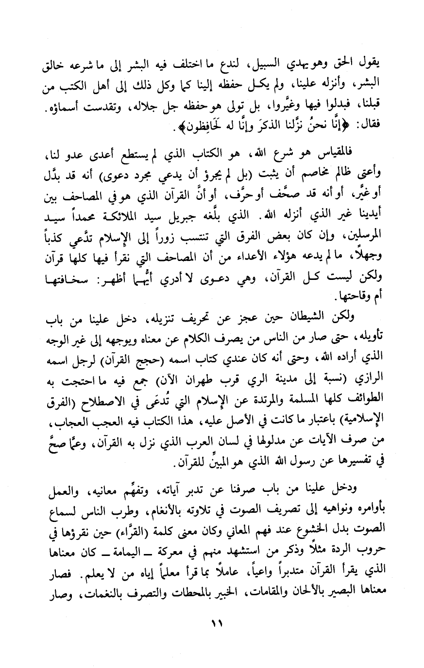 ولكن الشيطان حين عجز عن تحريف تنزيله، دخل علينا من باب تأويله، حتى صار من الناس من يصرف الكلام عن معناه ويوجهه إلى غير الوجه الذي أراده الله، وحتى أنه كان عندي كتاب اسمه (حجج القرآن) لرجل اسمه الرازي (نسبة إلى مدينة الري قرب طهران الآن) جمع فيه ما احتجت به الطوائف كلها المسلمة والمرتدة عن الإسلام التي تُدعَى في الاصطلاح (الفرق الإسلامية) باعتبار ما كانت في الأصل عليه، هذا الكتاب فيه العجب العجاب، من صرف الآيات عن مدلولها في لسان العرب الذي نزل به القرآن، وعمَّا صحَّ في تفسيرها عن رسول الله الذي هو المبينِّ للقرآن.