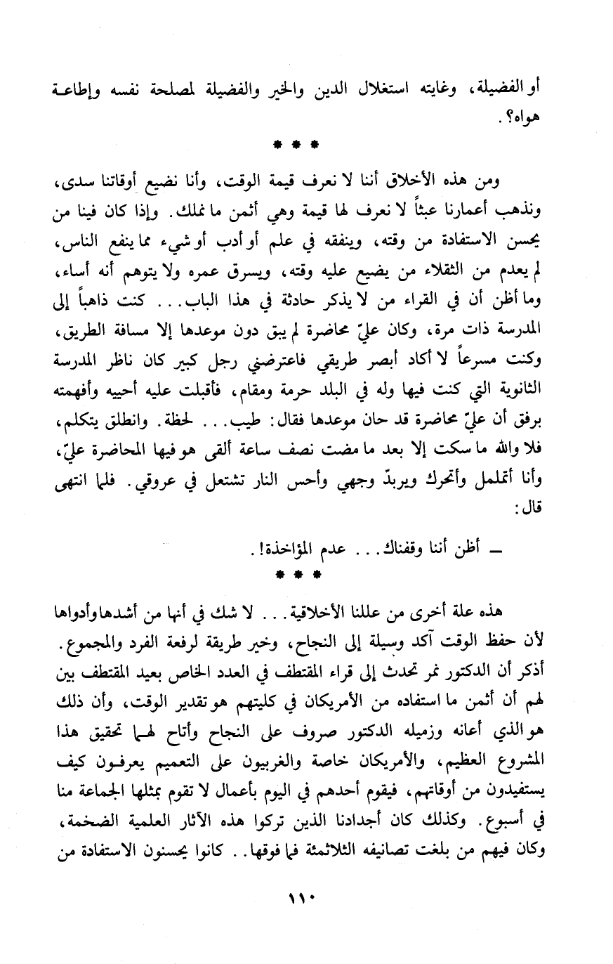 ومن هذه الأخلاق أننا لا نعرف قيمة الوقت، وأنا نضيع أوقاتنا سدى، ونذهب أعمارنا عبثاً لا نعرف لها قيمة وهي أثمن ما نملك. وإذا كان فينا من يحسن الاستفادة من وقته، وينفقه في علم أو أدب أو شيء مما ينفع الناس، لم يعدم من الثقلاء من يضيع عليه وقته، ويسرق عمره ولا يتوهم أنه أساء، وما أظن أن في القراء من لا يذكر حادثة في هذا الباب ... كنت ذاهباً إلى المدرسة ذات مرة، وكان عليّ محاضرة لم يبق دون موعدها إلا مسافة الطريق، وكنت مسرعاً لا أكاد أبصر طريقي فاعترضني رجل كبير كان ناظر المدرسة الثانوية التي كنت فيها وله في البلد حرمة ومقام، فأقبلت عليه أحييه وأفهمته برفق أن عليّ محاضرة قد حان موعدها فقال: طيب ... لحظة. وانطلق يتكلم، فلا والله ما سكت إلا بعد ما مضت نصف ساعة ألقى هو فيها المحاضرة عليّ، وأنا أتململ وأتحرك ويربدّ وجهي وأحس النار تشتعل في عروقي. فلما انتهى قال:
