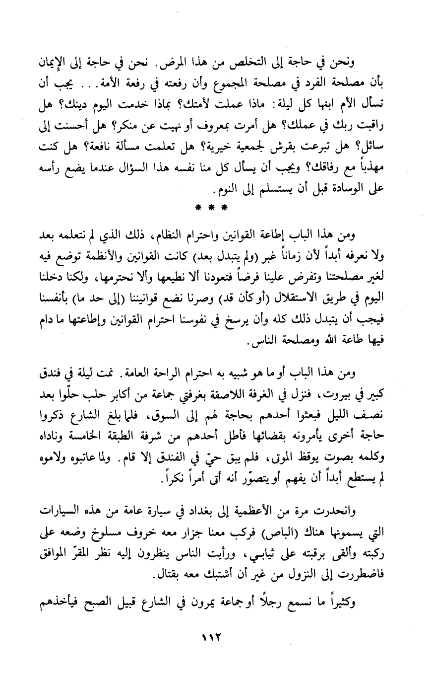 ومن هذا الباب إطاعة القوانين واحترام النظام، ذلك الذي لم نتعلمه بعد ولا نعرفه أبداً لأن زماناً غبر (ولم يتبدل بعد) كانت القوانين والأنظمة توضع فيه لغير مصلحتنا وتفرض علينا فرضاً فتعودنا ألا نطيعها وألا نحترمها، ولكنا دخلنا اليوم في طريق الاستقلال (أو كأن قد) وصرنا نضع قوانيننا (إلى حد ما) بأنفسنا فيجب أن يتبدل ذلك كله وأن يرسخ في نفوسنا احترام القوانين وإطاعتها ما دام فيها طاعة الله ومصلحة الناس.