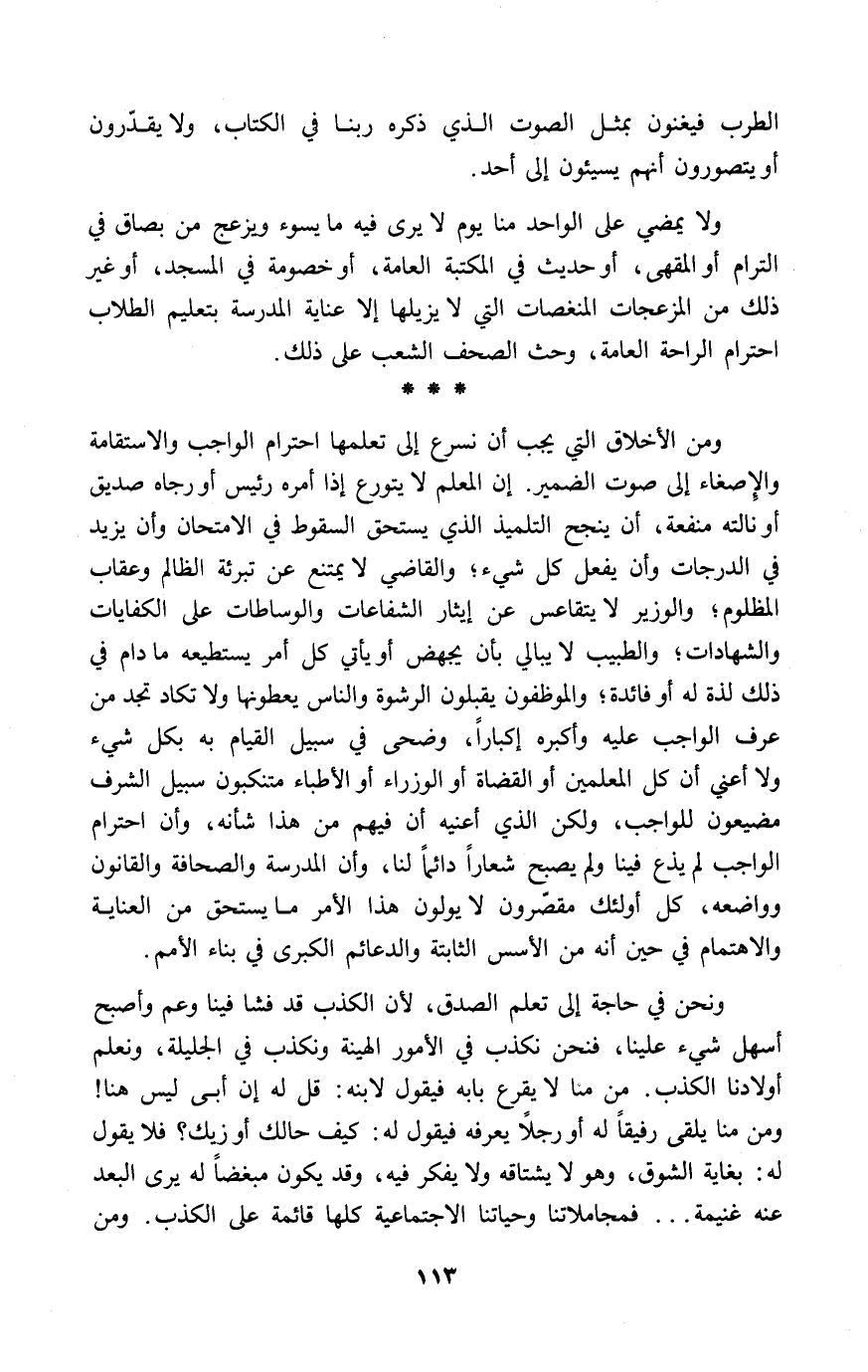 ومن الأخلاق التي يجب أن نسرع إلى تعلمها احترام الواجب والاستقامة والإصغاء إلى صوت الضمير. إن المعلم لا يتورع إذا أمره رئيس أو رجاه صديق أو نالته منفعة، أن ينجح التلميذ الذي يستحق السقوط في الامتحان وأن يزيد في الدرجات وأن يفعل كل شيء؛ والقاضي لا يمتنع محن تبرئة الظالم وعقاب المظلوم؛ والوزير لا يتقاعس عن إيثار الشفاعات والوساطات على الكفايات والشهادات؛ والطبيب لا يبالي بأن يجهض أو يأتي كل أمر يستطيعه ما دام في ذلك لذة له أو فائدة؛ والموظفون يقبلون الرشوة والناس يعطونها ولا تكاد تجد من عرف الواجب عليه وأكبره إكباراً، وضحى في سبيل القيام به بكل شيء ولا أعني أن كل المعلمين أو القضاة أو الوزراء أو الأطباء متنكبون سبيل الشرف مضيعون للواجب، ولكن الذي أعنيه أن فيهم من هذا شأنه، وأن احترام الواجب لم يذع فينا ولم يصبح شعاراً دائماً لنا، وأن المدرسة والصحافة والقانون وواضعه، كل أولئك مقصّرون لا يولون هذا الأمر ما يستحق من العناية والاهتمام في حين أنه من الأسس الثابتة والدعائم الكبرى في بناء الأمم.