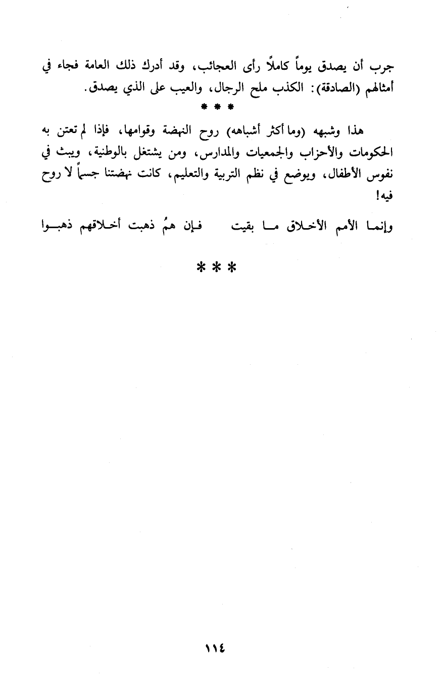 هذا وشبهه (وما أكثر أشباهه) روح النهضة وقوامها، فإذا لم تعتن به الحكومات والأحزاب والجمعيات والمدارس، ومن يشتغل بالوطنية، ويبث في نفس الأطفال، ويوضع في نظم التربية والتعليم، كانت نهضتنا جسماً لا روح فيه!