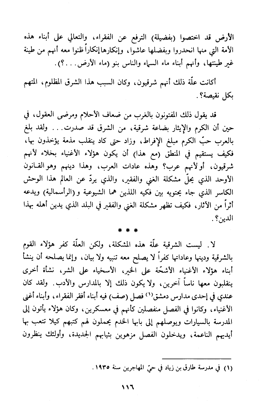 لا. ليست الشرقية علّة هذه المشكلة، ولكن العلّة كفر هؤلاء القوم بالشرقية ودينها وعاداتها كفراً لا يصلح معه تنبيه ولا بيان، وإنما يصلحه أن ينشأ أبناء هؤلاء الأغنياء الأشحّة على الخير، الأسخياء على الشر، نشأة أخرى ينقلبون معها ناساً آخرين، ولا يكون ذلك إلا بالمدارس والأدب. ولقد كان عندي في إحدى مدارس دمشق (¬1) فصل (صف) فيه أبناء أفقر الفقراء، وأبناء أغنى الأغنياء، وكانوا في الفصل منفصلين كأنهم في معسكرين، وكان هؤلاء يأتون إلى المدرسة بالسيارات ويوصلهم إلى بابها الخدم يحملون لهم كتبهم كيلا تتعب بها أيديهم الناعمة، ويدخلون الفصل مزهوين بثيابهم الجديدة، وأولئك ينظرون