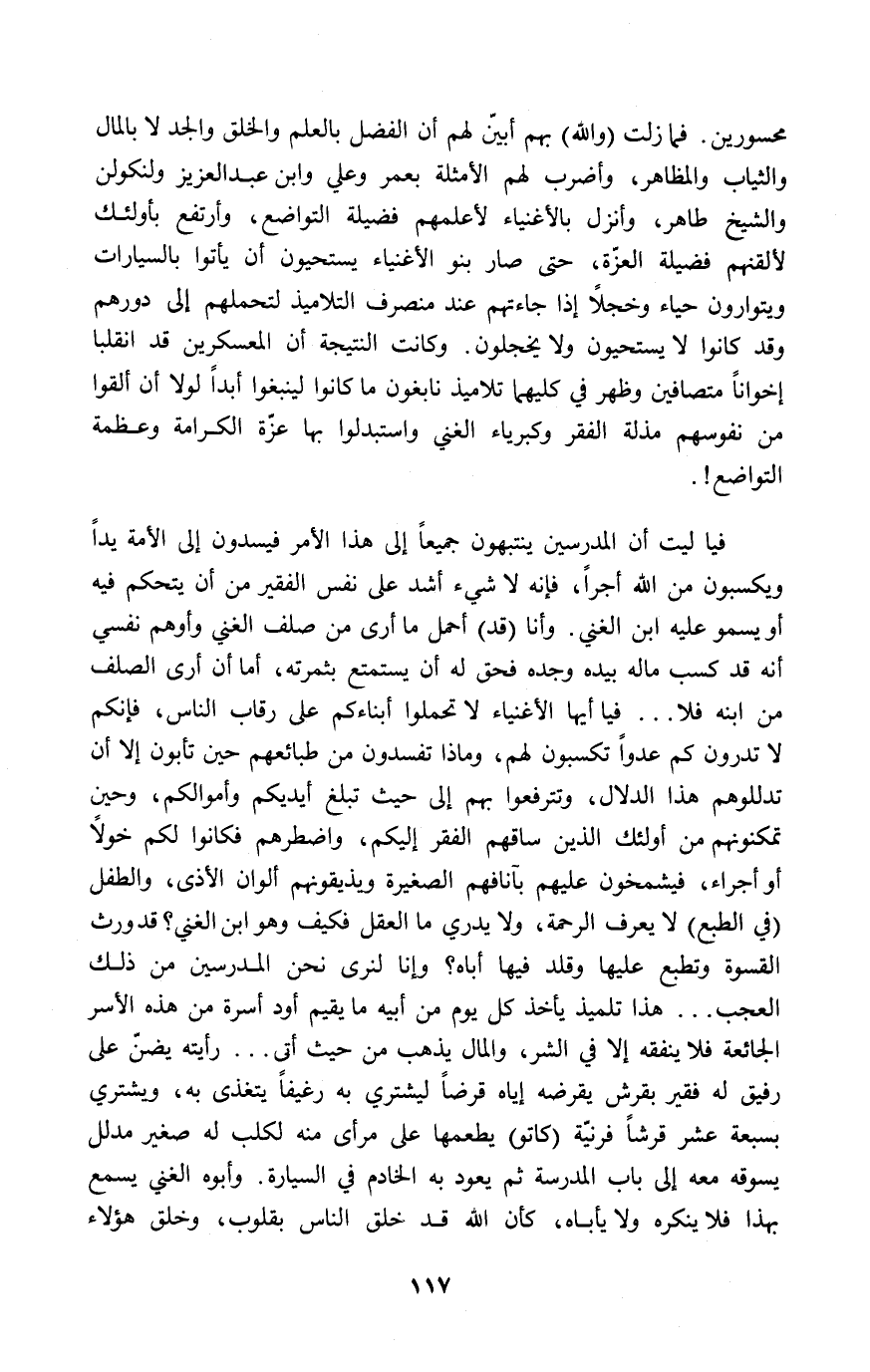 محسورين. فما زلت (والله) بهم أبينّ لهم أن الفضل بالعلم والخلق والجد لا بالمال والثياب والمظاهر، وأضرب لهم الأمثلة بعمر وعلي وابن عبدالعزيز ولنكولن والشيخ طاهر، وأنزل بالأغنياء لأعلمهم فضيلة التواضع، وأرتفع بأولئك لألقنهم فضيلة العزّة، حتى صار بنو الأغنياء يستحيون أن يأتوا بالسيارات ويتوارون حياء وخجلاً إذا جاءتهم عند منصرف التلاميذ لتحملهم إلى دورهم وقد كانوا لا يستحيون ولا يخجلون. وكانت النتيجة أن المعسكرين قد انقلبا إخواناً متصافين وظهر في كليهما تلاميذ نابغون ما كانوا لينبغوا أبداً لولا أن ألقوا من نفوسهم مذلة الفقر وكبرياء الغني واستبدلوا بها عزّة الكرامة وعظمة التواضع!.