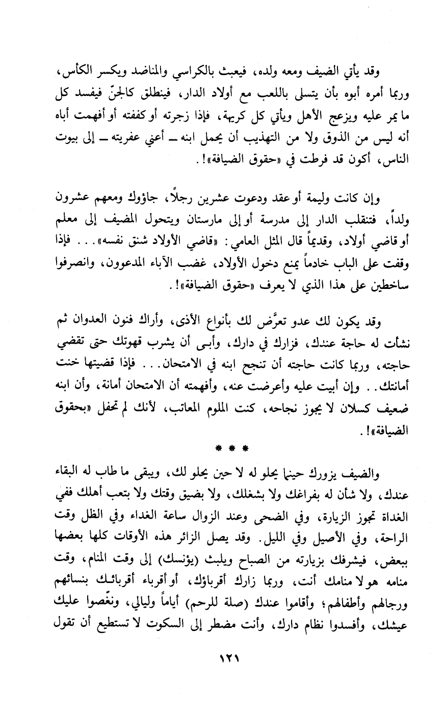 وقد يأتي الضيف ومعه ولده، فيعبث بالكراسي والمناضد ويكسر الكأس، وربما أمره أبوه بأن يتسلى باللعب مع أولاد الدار، فينطلق كالجنّ فيفسد كل ما يمر عليه ويزعج الأهل ويأتي كل كريهة، فإذا زجرته أو كففته أو أفهمت أباه أنه ليس من الذوق ولا من التهذيب أن يحمل ابنه -أعني عفريته- إلى بيوت الناس، أكون قد فرطت في «حقوق الضيافة»!.