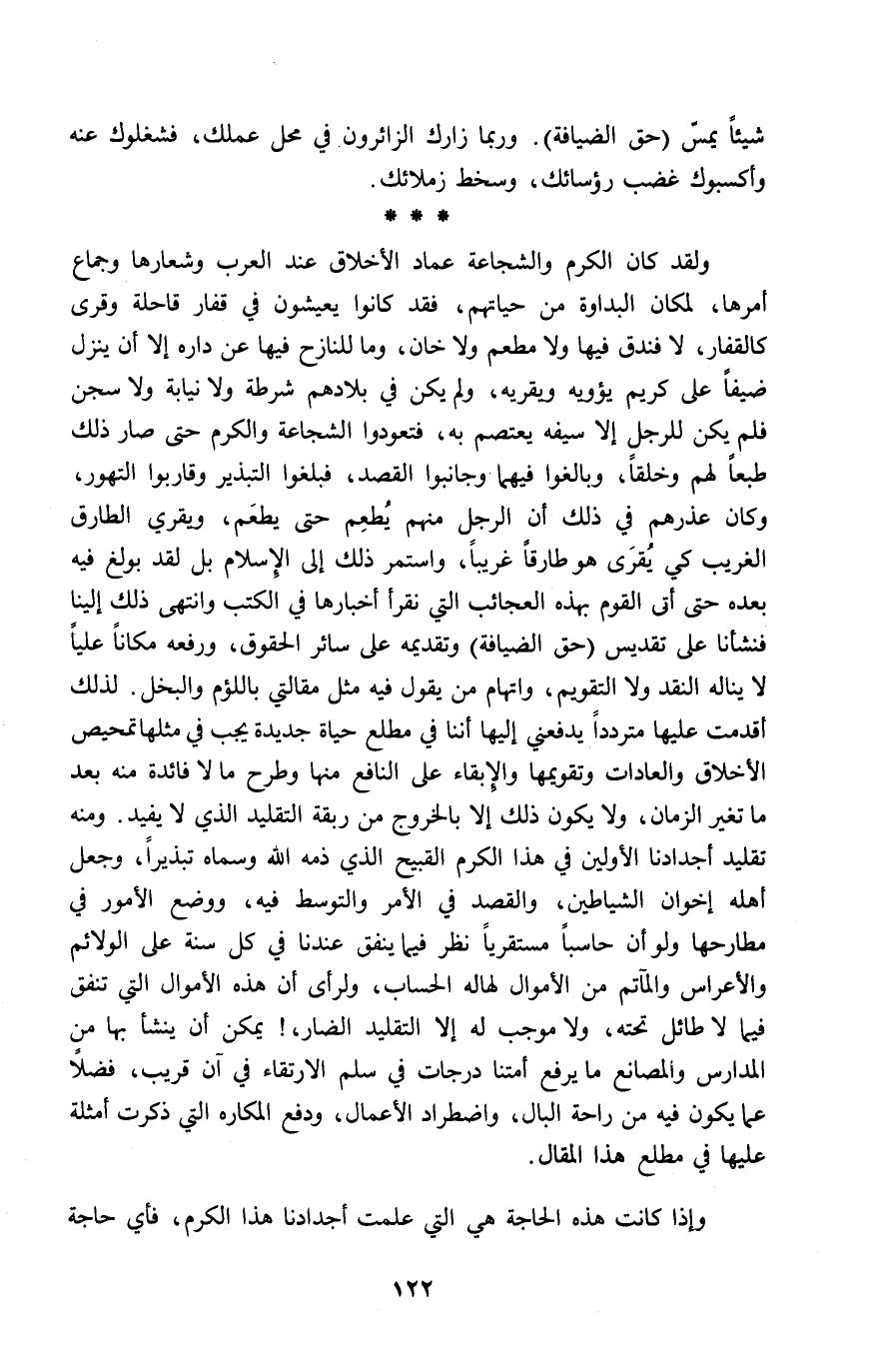 ولقد كان الكرم والشجاعة عماد الأخلاق عند العرب وشعارها وجماع أمرها، لمكان البداوة من حياتهم، فقد كانوا يعيشون في قفار قاحلة وقرى كالقفار، لا فندق فيها ولا مطعم ولا خان، وما للنازح فيها عن داره إلا أن ينزل ضيفاً على كريم يؤويه ويقريه، ولم يكن في بلادهم شرطة ولا نيابة ولا سجن فلم يكن للرجل إلا سيفه يعتصم به، فتعودوا الشجاعة والكرم حتى صار ذلك طبعاً لهم وخلقاً، وبالغوا فيهما وجانبوا القصد، فبلغوا التبذير وقاربوا التهور، وكان عذرهم في ذلك أن الرجل منهم يُطعِم حتى يطعَم، ويقري الطارق الغريب كي يُقرَى هو طارقاً غريباً، واستمر ذلك إلى الإسلام بل لقد بولغ فيه بعده حتى أتى القوم بهذه العجائب التي نقرأ أخبارها في الكتب وانتهى ذلك إلينا فنشأنا على تقديس (حق الضيافة) وتقديمه على سائر الحقوق، ورفعه مكاناً علياً لا يناله النقد ولا التقويم، واتهام من يقول فيه مثل مقالتي باللؤم والبخل. لذلك أقدمت عليها متردداً يدفعني إليها أننا في مطلع حياة جديدة يجب في مثلها تمحيص الأخلاق والعادات وتقويمها والإبقاء على النافع منها وطرح ما لا فائدة منه بعد ما تغير الزمان، ولا يكون ذلك إلا بالخروج من ربقة التقليد الذي لا يفيد. ومنه تقليد أجدادنا الأولين في هذا الكرم القبيح الذي ذمه الله وسماه تبذيراً، وجعل أهله إخوان الشياطين، والقصد في الأمر والتوسط فيه، ووضع الأمور في مطارحها ولو أن حاسباً مستقرياً نظر فيما ينفق عندنا في كل سنة على الولائم والأعراس والمآتم من الأموال لهاله الحساب، ولرأى أن هذه الأموال التي تنفق فيما لا طائل تحته، ولا موجب له إلا التقليد الضار،! يمكن أن ينشأ بها من المدارس والمصانع ما يرفع أمتنا درجات في سلم الارتقاء في آن قريب، فضلاً عما يكون فيه من راحة البال، واضطراد الأعمال، ودفع المكاره التي ذكرت أمثلة عليها في مطلع هذا المقال.