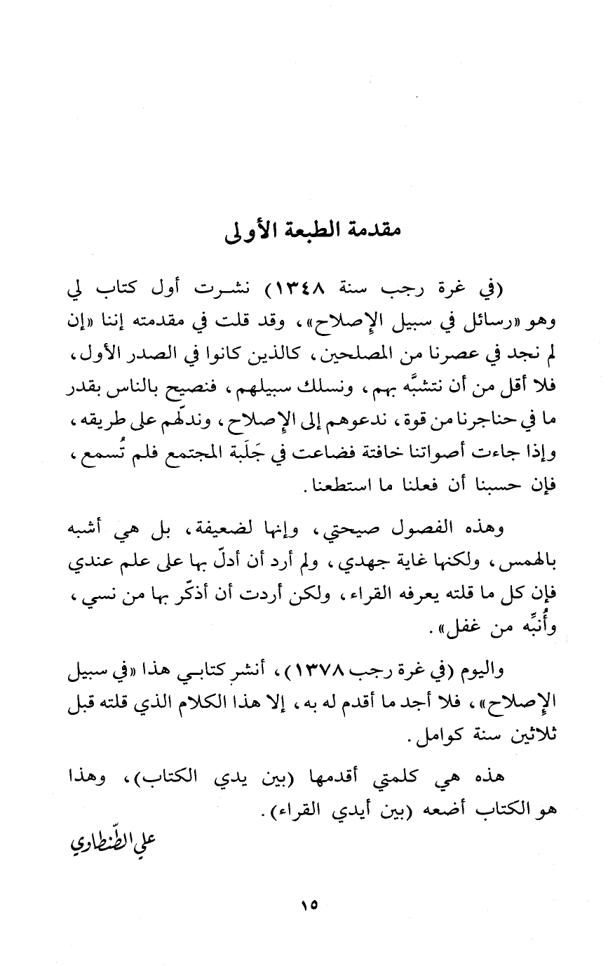 واليوم (في غرة رجب 1378)، أنشر كتابي هذا «في سبيل الإصلاح»، فلا أجد ما أقدم له به، إلا هذا الكلام الذي قلته قبل ثلاثين سنة كوامل.