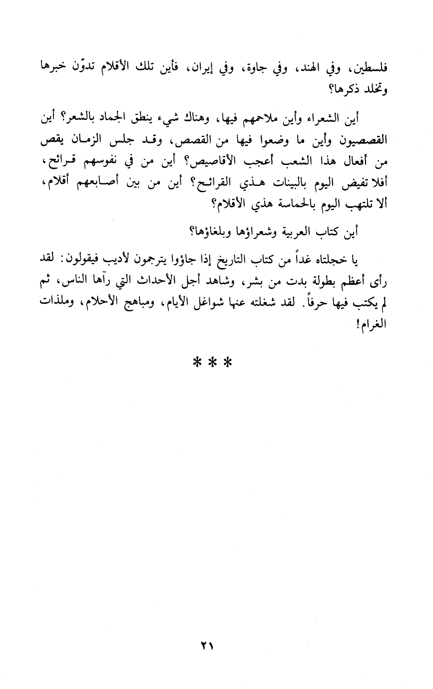 أين الشعراء وأين ملاحمهم فيها، وهناك شيء ينطق الجماد بالشعر؟ أين القصصيون وأين ما وضعوا فيها من القصص، وقد جلس الزمان يقص من أفعال هذا الشعب أعجب الأقاصيص؟ أين من في نفوسهم قرائح، أفلا تفيض اليوم بالبينات هذا القرائح؟ أين من بين أصابعهم أقلام، ألا تلتهب اليوم بالحماسة هذه الأقلام؟