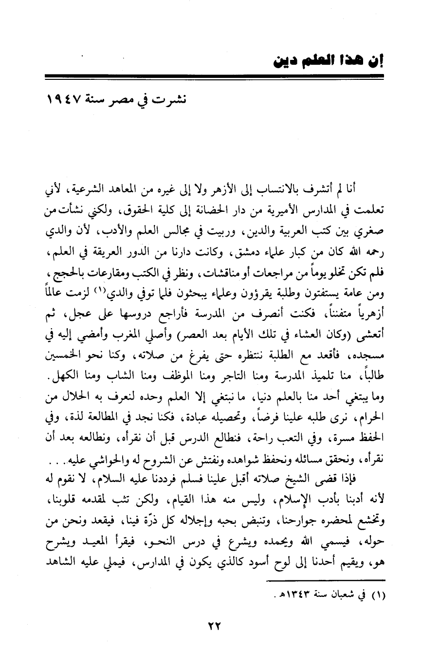 أنا لم أتشرف بالانتساب إلى الأزهر ولا إلى غيره من المعاهد الشرعية، لأني تعلمت في المدارس الأميرية من دار الحضانة إلى كلية الحقوق، ولكني نشأت من صغري بين كتب العربية والدين، وربيت في مجالس العلم والأدب، لأن والدي رحمه الله كان من كبار علماء دمشق، وكانت دارنا من الدور العريقة في العلم، فلم تكن تخلو يوماً من مراجعات أو مناقشات، ونظر في الكتب ومقارعات بالحجج، ومن عامة يستفتون وطلبة يقرؤون وعلماء يبحثون فلما توفي والدي (¬1) لزمت عالماً أزهرياً متفنناً، فكنت أنصرف من المدرسة فأراجع دروسها على عجل، ثم أتعشى (وكان العشاء في تلك الأيام بعد العصر) وأصلي المغرب وأمضي إليه في مسجده، فأقعد مع الطلبة ننتظره حتى يفرغ من صلاته، وكنا نحو الخمسين طالباً، منا تلميذ المدرسة ومنا التاجر ومنا الموظف ومنا الشاب ومنا الكهل. وما يبتغي أحد منا بالعلم دنيا، ما نبتغي إلا العلم وحده لنعرف به الحلال من الحرام، نرى طلبه علينا فرضاً، وتحصيله عبادة، فكنا نجد في المطالعة لذة، وفي الحفظ مسرة، وفي التعب راحة، فنطالع الدرس قبل أن نقرأه، ونطالعه بعد أن نقرأه، ونحقق مسائله ونحفظ شواهده ونفتش عن الشروح له والحواشي عليه ...