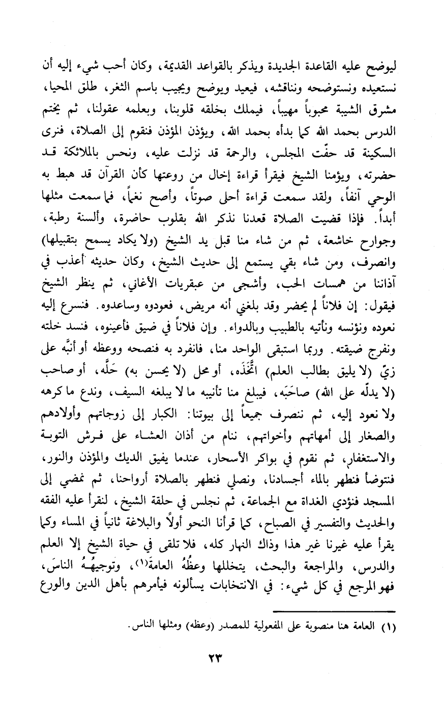 ليوضح عليه القاعدة الجديدة ويذكر بالقواعد القديمة، وكان أحب شيء إليه أن نستعيده ونستوضحه ونناقشه، فيعيد ويوضح ويجيب باسم الثغر، طلق المحيا، مشرق الشيبة محبوباً مهيباً، فيملك بخلقه قلوبنا، وبعلمه عقولنا، ثم يختم الدرس بحمد الله كما بدأه بحمد الله، ويؤذن المؤذن فنقوم إلى الصلاة، فنرى السكينة قد حفّت المجلس، والرحمة قد نزلت عليه، ونحس بالملائكة قد حضرته، ويؤمنا الشيخ فيقرأ قراءة إخال من روعتها كأن القرآن قد هبط به الوحي آنفاً، ولقد سمعت قراءة أحلى صوتاً، وأصح نغماً، فما سمعت مثلها أبداً. فإذا قضيت الصلاة قعدنا نذكر الله بقلوب حاضرة، وألسنة رطبة، وجوارح خاشعة، ثم من شاء منا قبل يد الشيخ (ولا يكاد يسمح بتقبيلها) وانصرف، ومن شاء بقي يستمع إلى حديث الشيخ، وكان حديثها أعذب في آذاننا من همسات الحب، وأشجى من عبقريات الأغاني، ثم ينظر الشيخ فيقول: إن فلاناً لم يحضر وقد بلغني أنه مريض، فعودوه وساعدوه. فنسرع إليه نعوده ونؤنسه ونأتيه بالطبيب وبالدواء. وإن فلاناً في ضيق فأعينوه، فنسد خلته ونفرج ضيقته. وربما استبقى الواحد منا، فانفرد به فنصحه ووعظه أو أنبَّه على زيّ (لا يليق بطالب العلم) اتَّخَذَه، أو محل (لا يحسن به) حَلَّه، أو صاحب (لا يدلّه على الله) صاحَبَه، فيبلغه منا تأنيبه ما لا يبلغه السيف، وندع ما كرهه ولا نعود إليه، ثم ننصرف جميعاً إلى بيوتنا: الكبار إلى زوجاتهم وأولادهم والصغار إلى أمهاتهم وأخواتهم، ننام من أذان العشاء على فرش التوبة والاستغفار، ثم نقوم في بواكر الأسحار، عندما يفيق الديك والمؤذن والنور، فنتوضأ فنطهر بالماء أجسادنا، ونصلي فنطهر بالصلاة أرواحنا، ثم نمضي إلى المسجد فنؤدي الغداة مع الجماعة، ثم نجلس في حلقة الشيخ، لنقرأ عليه الفقه والحديث والتفسير في الصباح، كما قرأنا النحو أولاً والبلاغة ثانياً في المساء وكما يقرأ عليه غيرنا غير هذا وذاك النهار كله، فلا تلقى في حياة الشيخ إلا العلم والدرس، والمراجعة والبحث، يتخللها وعظُةُ العامةَ (¬1)، وتوجيهُهُ الناسَ، فهو المرجع في كل شيء: في الانتخابات يسألونه فيأمرهم بأهل الدين والورع