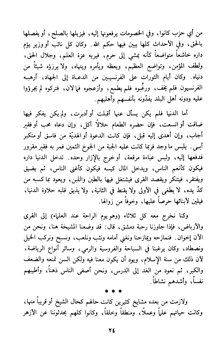 ولازمت من بعده مشايخ كثيرين كانت حالهم كحال الشيخ أو قريباً منها، وكانت حياتهم علماً وعملاً، ومنطقاً وخلقاً، وكانوا كلهم يحدثوننا عن الأزهر