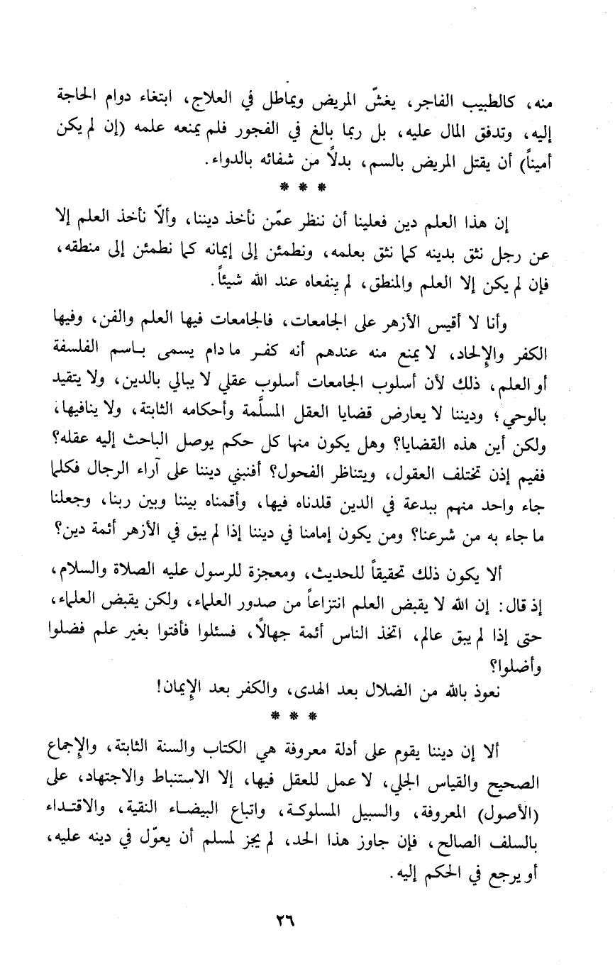 إن هذا العلم دين فعلينا أن ننظر عمّن نأخذ ديننا، وألّا نأخذ العلم إلا عن رجل نثق بدينه كما نثق بعلمه، ونطمئن إلى إيمانه كما نطمئن إلى منطقه، فإن لم يكن إلا العلم والمنطق، لم ينفعاه عند الله شيئاً.