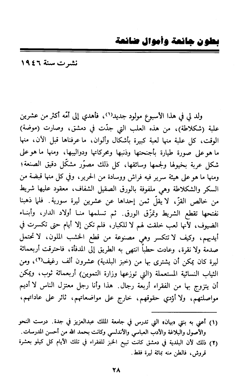 ولد لي في هذا الأسبوع مولود جديد (¬1)، فأهدي إلى أمّه أكثر من عشرين علبة (شكلاطة)، من هذه العلب التي جدّت في دمشق، وصارت (موضة) الوقت، كل علبة منها لعبة كبيرة بأشكال وألوان، ما عرفناها قبل الآن، منها ما هو على صورة طيارة بأجنحتها وذنبها ومحركاتها ودواليبها، ومنها ما هو على شكل عربة بخيولها ولجمها وسائقها، كل ذلك مصوّر مشكّل دقيق الصنعة؛ ومنها ما هو على هيئة سرير فيه فراش ووسادة من الحرير، وفي كل منها قبضة من السكر والشكلاطة وهي ملفوفة بالورق الصقيل الشفاف، معقود عليها شريط من خالص القزّ، لا نقلّ ثمن إحداها عن عشرين ليرة سورية. فلما ذهبنا نفتحها تقطع الشريط وتمزّق الورق. ثم تسلمها منا أولاد الدار، وأبناء الضيوف، لأنها لعب خلقت لهم لا للكبار، فلم تكن إلا أيام حتى تكسرت في أيديهم، وكيف لا تتكسر وهي مصنوعة من قطع الخشب الملون، لا تحتمل صدمة ولا نقرة، وعادت حطباً انتهى به الطريق إلى المدفأة، فاحترقت أربعمائة ليرة كان يمكن أن يشترى بها من (خبز البلدية) عشرون ألف رغيف (¬2)، ومن الثياب النسائية المستعملة (التي توزعها وزارة التموين) أربعمائة ثوب، ويمكن أن يتزوج بها من الفقراء أربعة رجال. هذا وأنا رجل معتزل الناس لا أديم مواصلتهم، ولا أؤدي حقوقهم، خارج على مواضعاتهم، ثائر على عاداتهم،