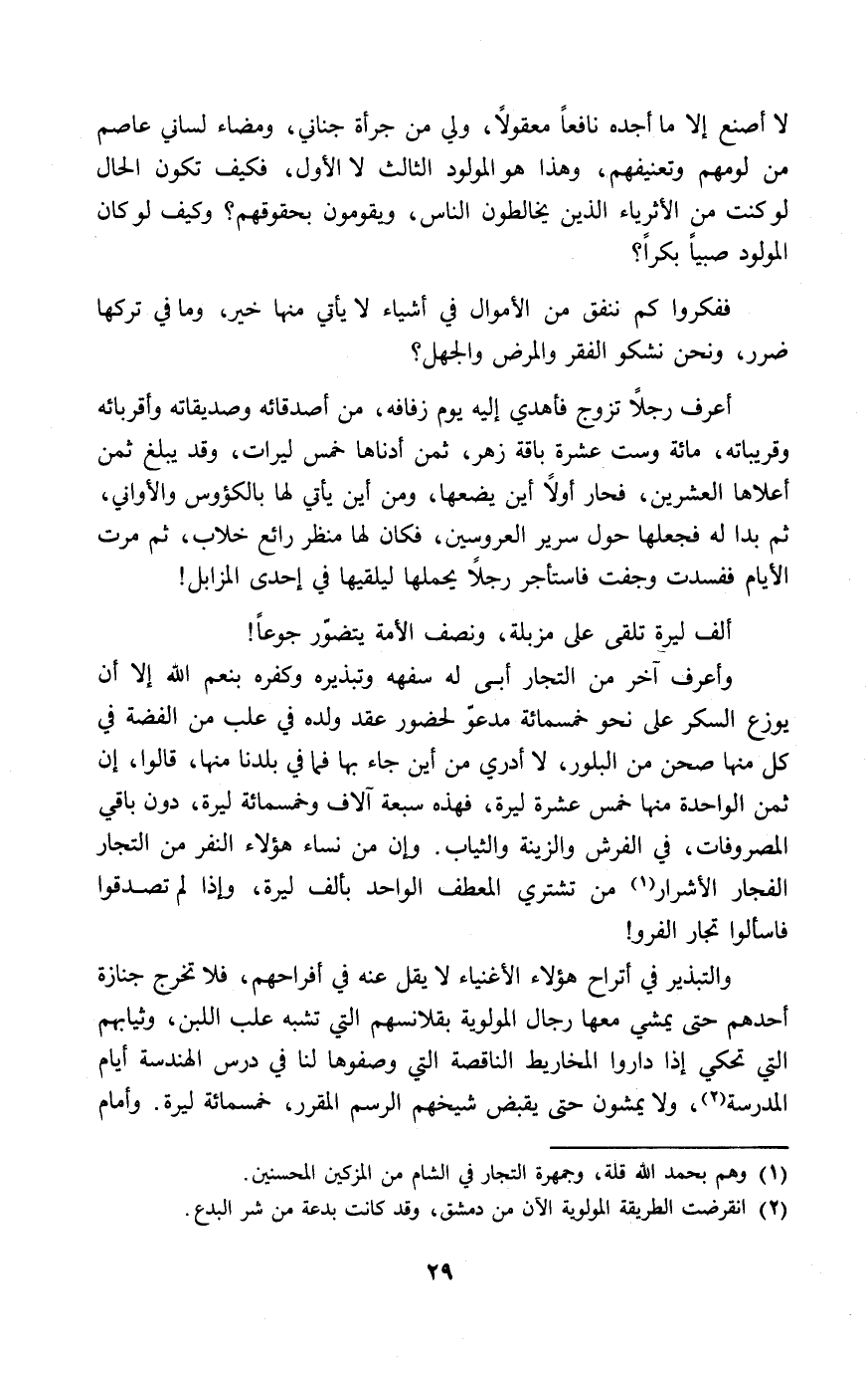 والتبذير في أتراح هؤلاء الأغنياء لا يقل عنه في أفراحهم، فلا تخرج جنازة أحدهم حتى يمشي معها رجال المولوية بقلانسهم التي تشبه علب اللبن، وثيابهم التي تحكي إذا داروا المخاليط الناقصة التي وصفوها لنا في درس الهندسة أيام المدرسة (¬2)، ولا يمشون حتى يقبض شيخهم الرسم المقرر، خمسمائة ليرة. وأمام