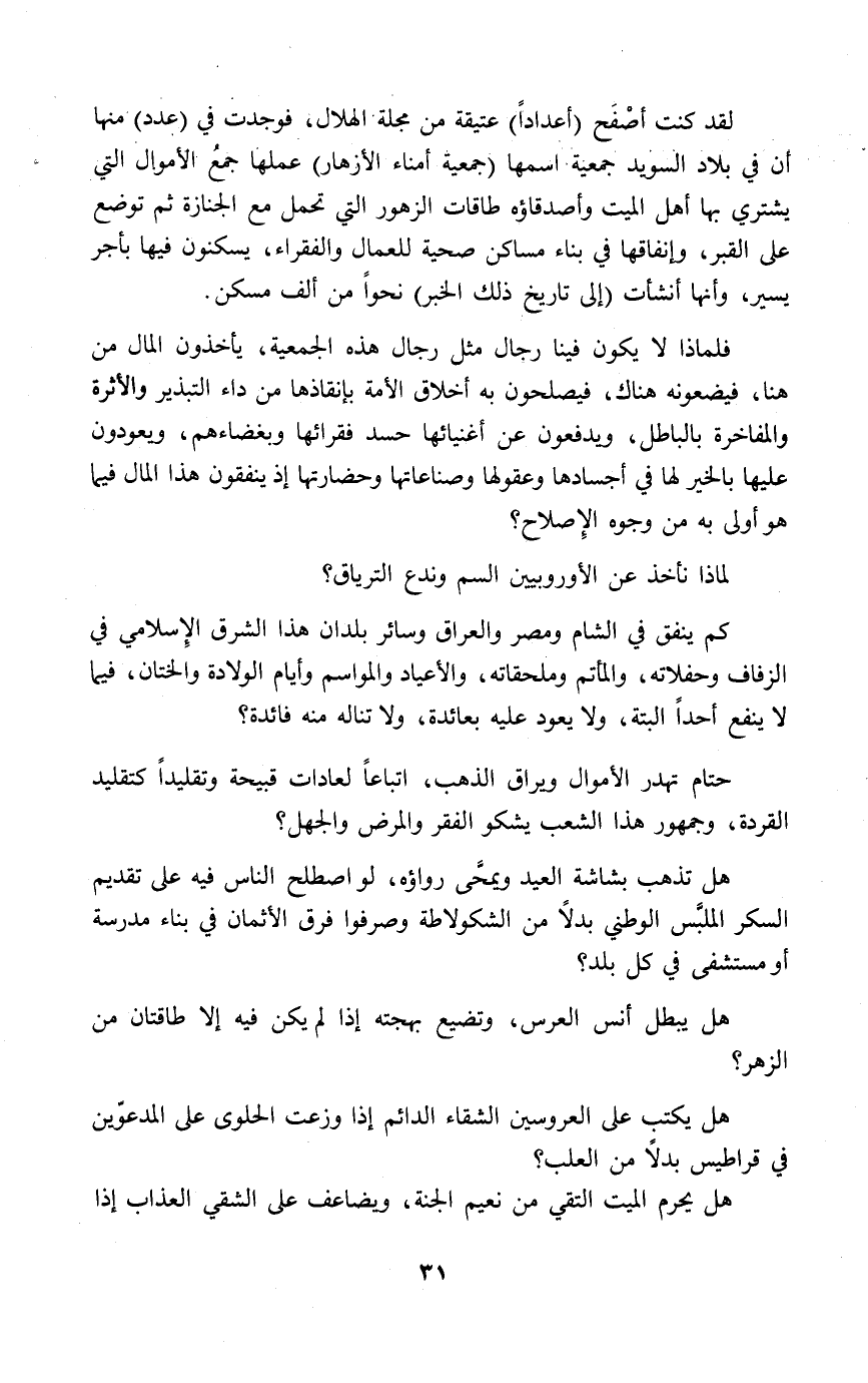 كم ينفق في الشام ومصر والعراق وسائر بلدان هذا الشرق الإسلامي في الزفاف وحفلاته، والمأتم وملحقاته، والأعياد والمواسم وأيام الولادة والختان، فيما لا ينفع أحداً البتة، ولا يعود عليه بعائدة، ولا تناله منه فائدة؟