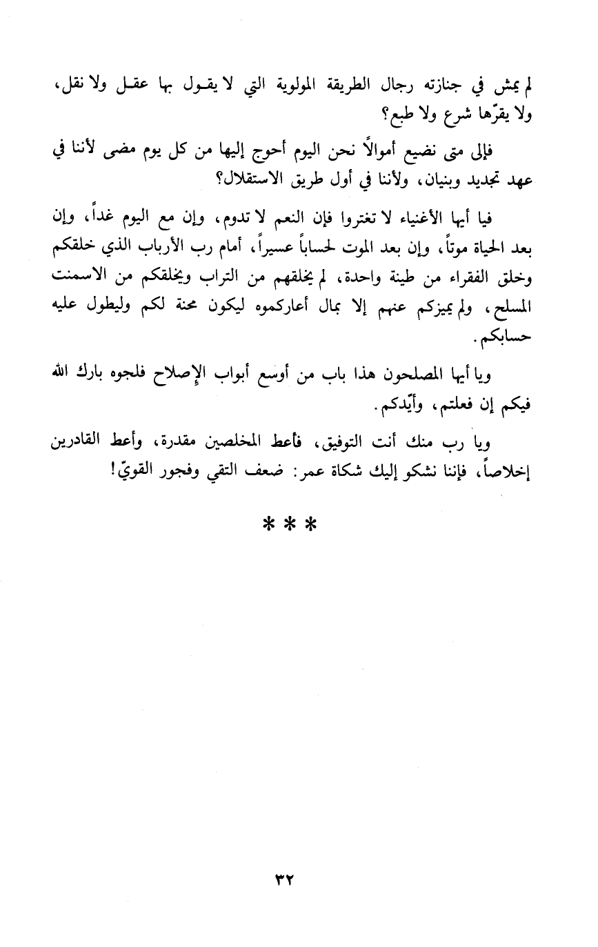 فيا أيها الأغنياء لا تغتروا فإن النعم لا تدور، وإن مع اليوم غداً، وإن بعد الحياة موتاً، وإن بعد الموت لحساباً عسيراً، أمام رب الأرباب الذي خلقكم وخلق الفقراء من طينة واحدة، لم يخلقهم من التراب ويخلقكم من الاسمنت المسلح، ولم يميزكم عنهم إلا بمال أعاركموه ليكون محنة لكم وليطول عليه حسابكم.