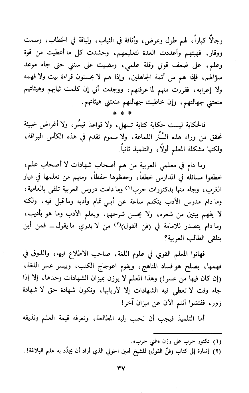 فالحكاية ليست حكاية كتابة تسهل، ولا قواعد تيسَّر، ولا أغراض خبيثة تحقق من وراء هذه السُتُر اللماعة، ولا سموم تقدم في هذه الكأس البراقة، ولكنها مشكلة المعلم أولاً، والتلميذ ثانياً.