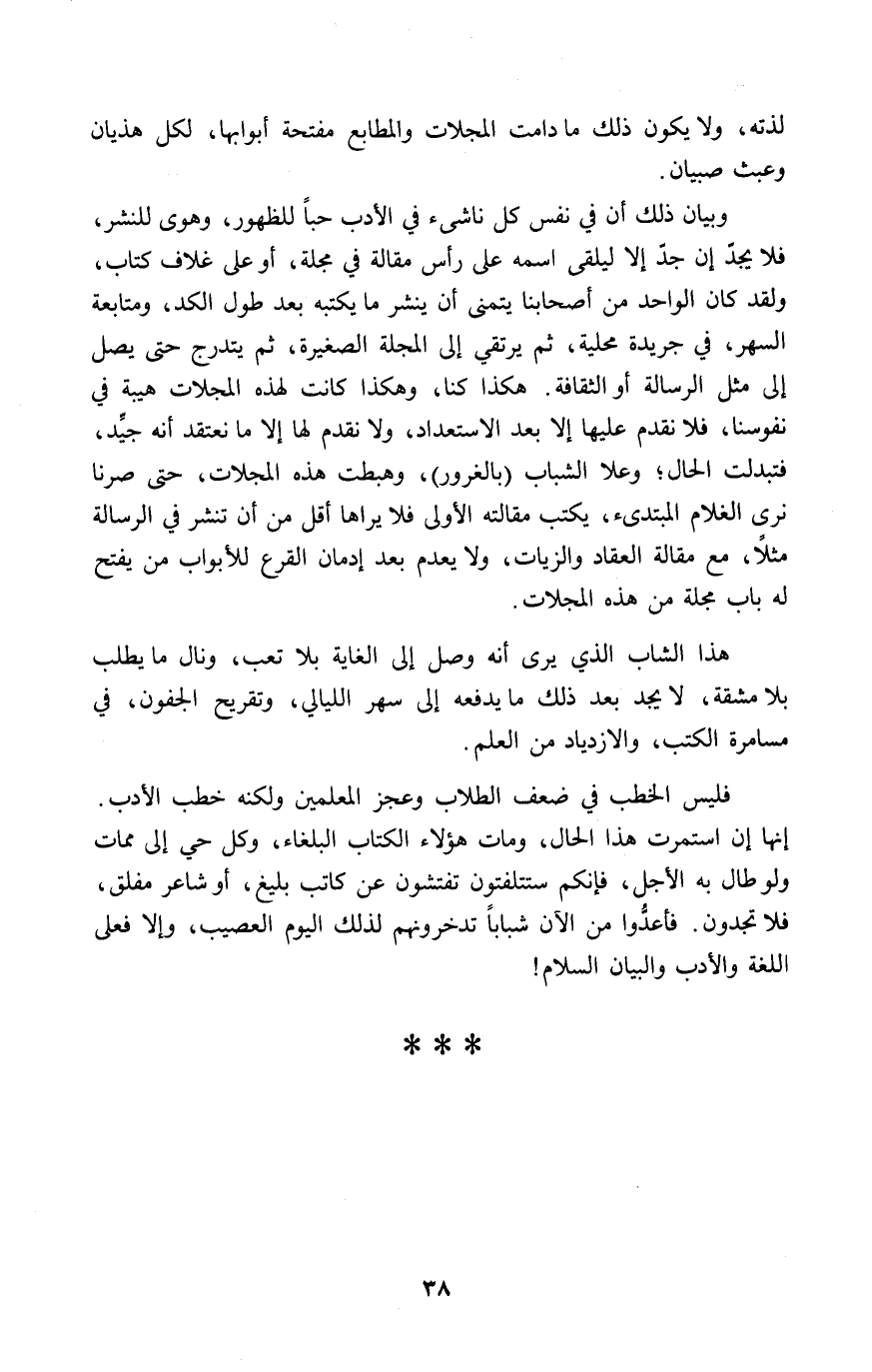 فليس الخطب في ضعف الطلاب وعجز المعلمين ولكنه خطب الأدب. إنها إن استمرت هذا الحال، ومات هؤلاء الكتاب البلغاء، وكل حي إلى ممات ولو طال به الأجل، فإنكم ستتلفتون تفتشون عن كاتب بليغ، أو شاعر مفلق، فلا تجدون. فأعدُّوا من الآن شباباً تدخرونهم لذلك اليوم العصيب، وإلا فعلى اللغة والأدب والبيان السلام!