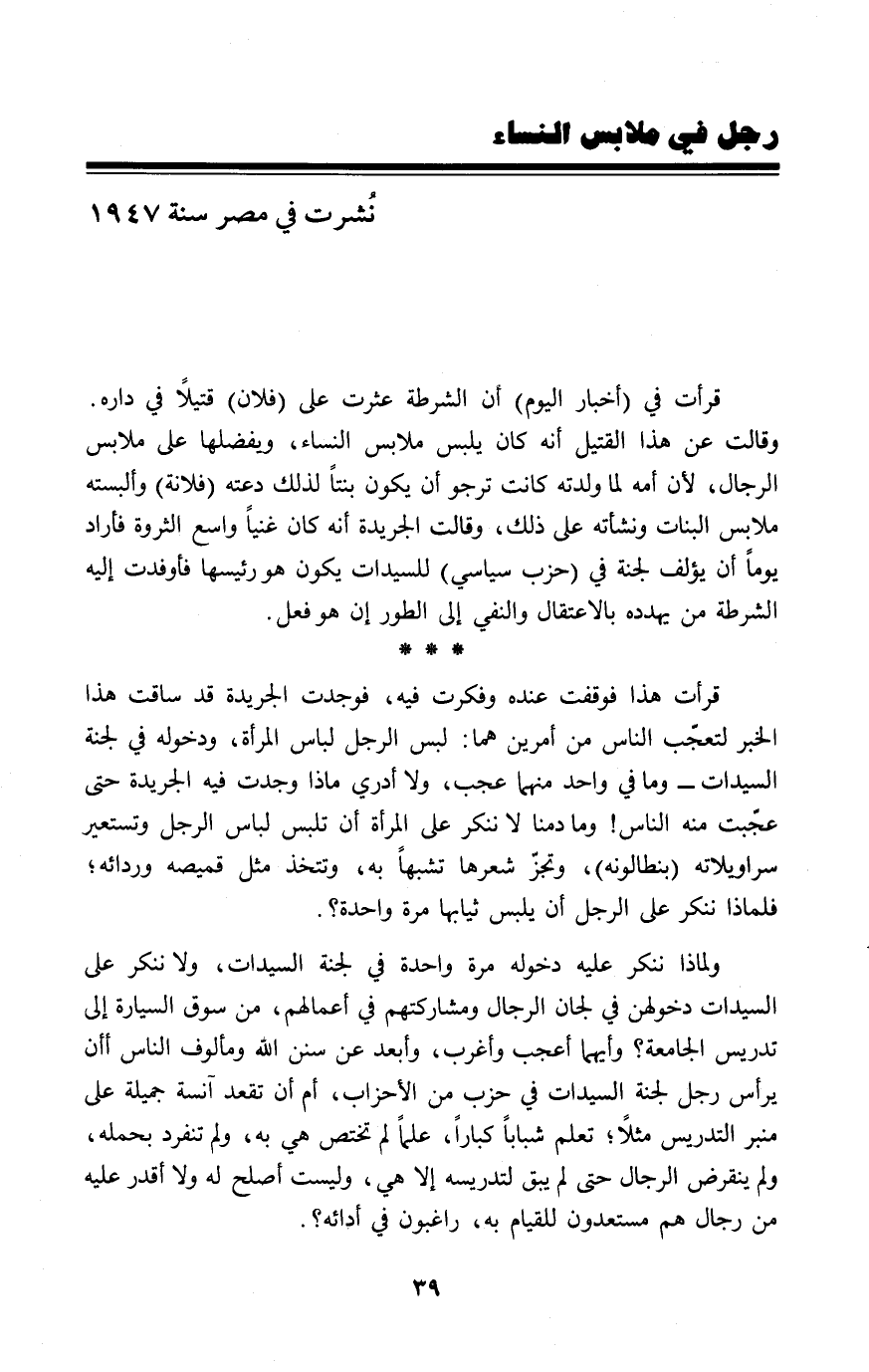 قرأت في (أخبار اليوم) آن الشرطة عثرت على (فلان) قتيلاً في داره. وقالت عن هذا القتيل أنه كان يلبس ملابس النساء، ويفضلها على ملابس الرجال، لأن أمه لما ولدته كانت ترجو أن يكون بنتاً لذلك دعته (فلانة) وألبسته ملابس البنات ونشأته على ذلك، وقالت الجريدة أنه كان غنياً واسع الثروة فأراد يوماً أن يؤلف لجنة في (حزب سياسي) للسيدات يكون هو رئيسها فأوفدت إليه الشرطة من يهدده بالاعتقال والنفي إلى الطور إن هو فعل.