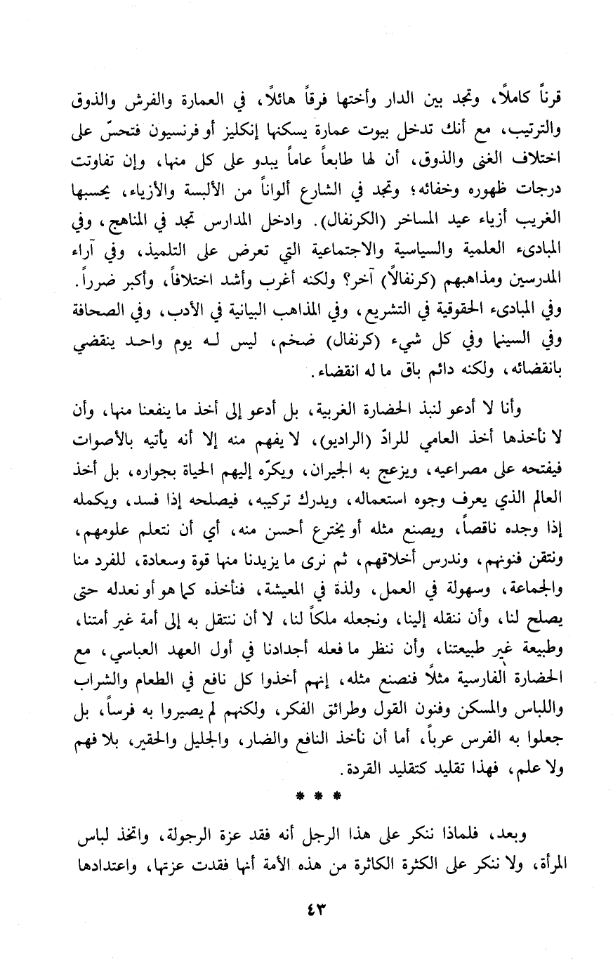 وأنا لا أدعو لنبذ الحضارة الغربية، بل أدعو إلى أخذ ما ينفعنا منها، وأن لا نأخذها أخذ العامي للرادّ (الراديو)، لا يفهم منه إلا أنه يأتيه بالأصوات فيفتحه على مصراعيه، ويزعج به الجيران، ويكرّه إليهم الحياة بجواره، بل أخذ العالم الذي يعرف وجوه استعماله، ويدرك تركيبه، فيصلحه إذا فسد، ويكمله إذا وجده ناقصاً، ويصنع مثله أو يخترع أحسن منه، أي أن نتعلم علومهم، ونتقن فنونهم، وندرس أخلاقهم، ثم نرى ما يزيدنا منها قوة وسعادة، للفرد منا والجماعة، وسهولة في العمل، ولذة في المعيشة، فنأخذه كما هو أو نعدله حتى يصلح لنا، وأن ننقله إلينا، ونجعله ملكاً لنا، لا أن ننتقل به إلى أمة غير أمتنا، وطبيعة غير طبيعتنا، وأن ننظر ما فعله أجدادنا في أول العهد العباسي، مع الحضارة الفارسية مثلاً فنصنع مثله، إنهم أخذوا كل نافع في الطعام والشراب واللباس والمسكن وفنون القول وطرائق الفكر، ولكنهم لم يصيروا به فرساً، بل جعلوا به الفرس عرباً، أما أن نأخذ النافع والضار، والجليل والحقير، بلا فهم ولا علم، فهذا تقليد كتقليد القردة.