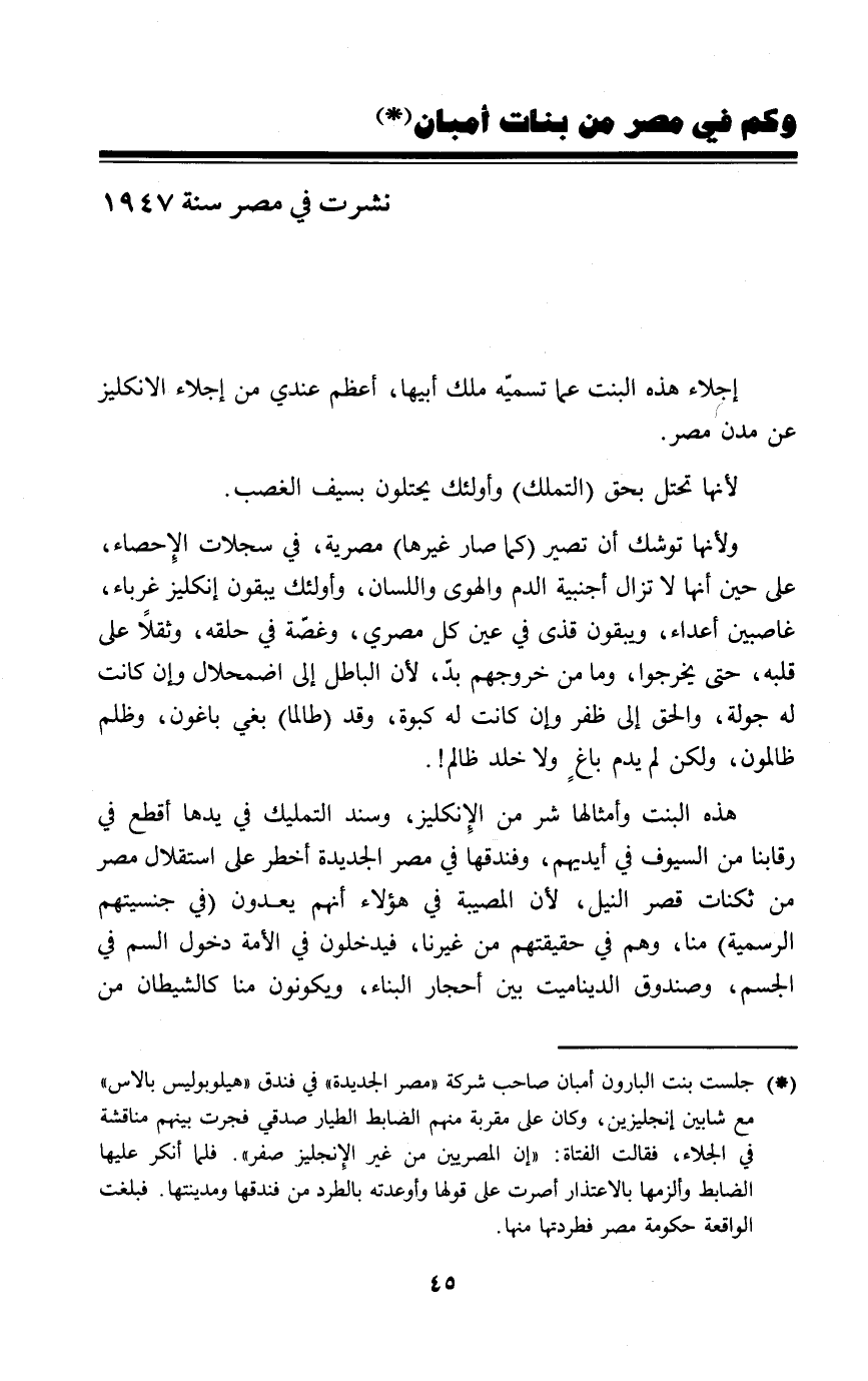 إجلاء هذه البنت عما تسميّه ملك أبيها، أعظم عندي من إجلاء الإنكليز عن مدن مصر.