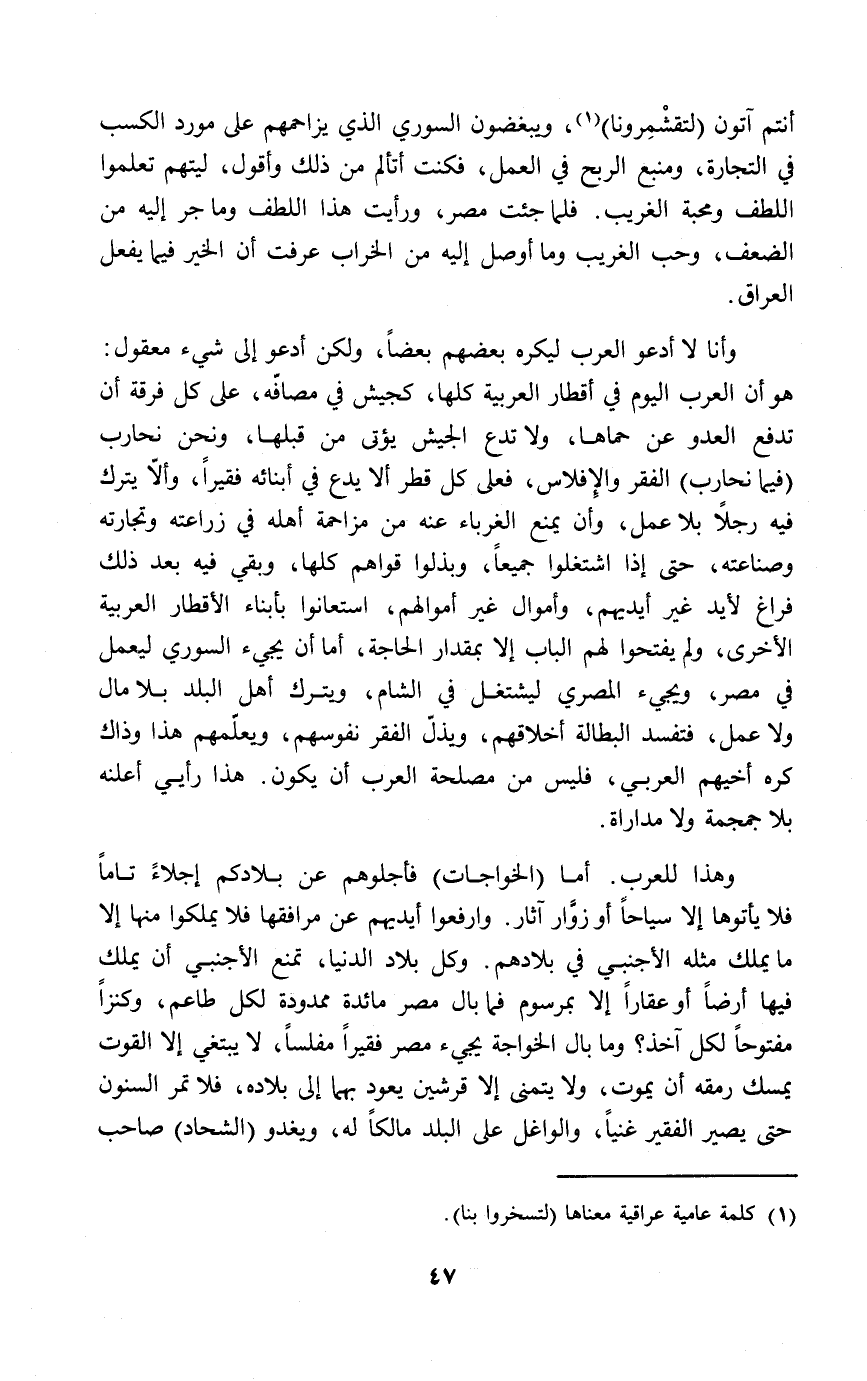 وهذا للعرب. أما (الخواجات) فأجلوهم عن بلادكم إجلاءً تاماً فلا يأتوها إلا سياحاً أو زوَّار آثار. وارفعوا أيديهم عن مرافقها فلا يملكوا منها إلا ما يملك مثله الأجنبي في بلادهم. وكل بلاد الدنيا، تمنع الأجنبي أن يملك فيها أرضاً أو عقاراً إلا بمرسوم فما بال مصر مائدة ممدودة لكل طاعم، وكنزاً مفتوحاً لكل آخذ؟ وما بال الخواجة يجيء مصر فقيراً مفلساً، لا يبتغي إلا القوت يمسك رمقه أن يموت، ولا يتمنى إلا قرشين يعود بهما إلى بلاده، فلا تمر السنون حتى يصير الفقير غنياً، والواغل على البلد مالكاً له، ويغدو (الشحاد) صاحب