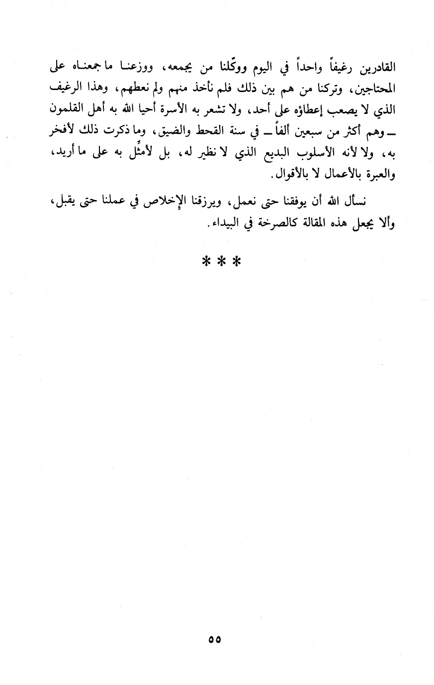 القادرين رغيفاً واحداً في اليوم ووكّلنا من يجمعه، ووزعنا ما جمعناه على المحتاجين، وتركنا من هم بين ذلك فلم نأخذ منهم ولم نعطهم، وهذا الرغيف الذي لا يصعب إعطاؤه على أحد، ولا تشعر به الأسرة أحيا الله به أهل القلمون -وهم أكثر من سبعين ألفاً- في سنة القحط والضيق، وما ذكرت ذلك لأفخر به، ولا لأنه الأسلوب البديع الذي لا نظير له، بل لأمثِّل به على ما أريد، والعبرة بالأعمال لا بالأقوال.