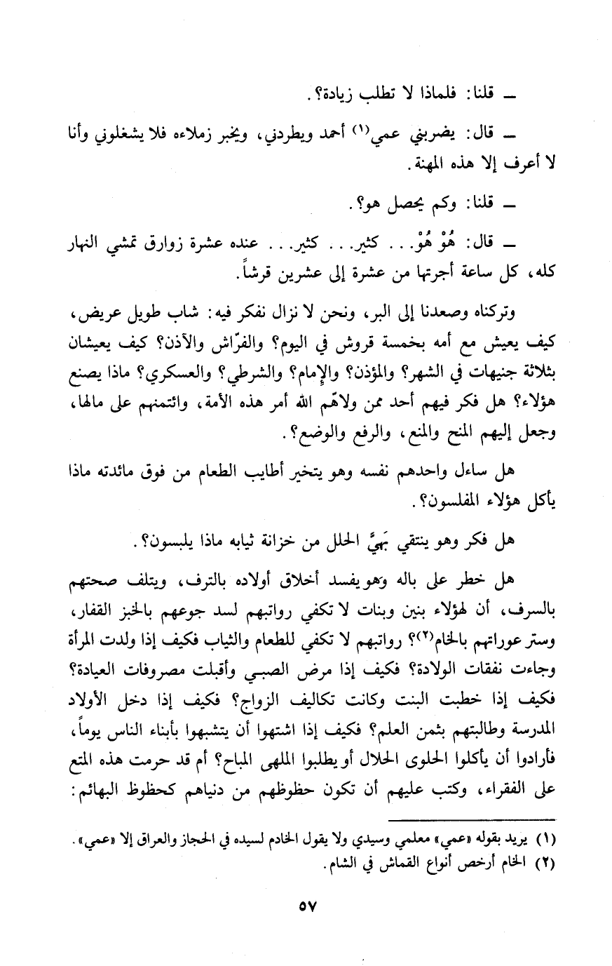وتركناه وصعدنا إلى البر، ونحن لا نزال نفكر فيه: شاب طويل عريض، كيف يعيش مع أمه بخمسة قروش في اليوم؟ والفرّاش والآذن؟ كيف يعيشان بثلاثة جنيهات في الشهر؟ والمؤذن؟ والإمام؟ والشرطي؟ والعسكري؟ ماذا يصنع هؤلاء؟ هل فكر فيهم أحد ممن ولاهّم الله أمر هذه الأمة، وائتمنهم على مالها، وجعل إليهم المنح والمنع، والرفع والوضع؟.