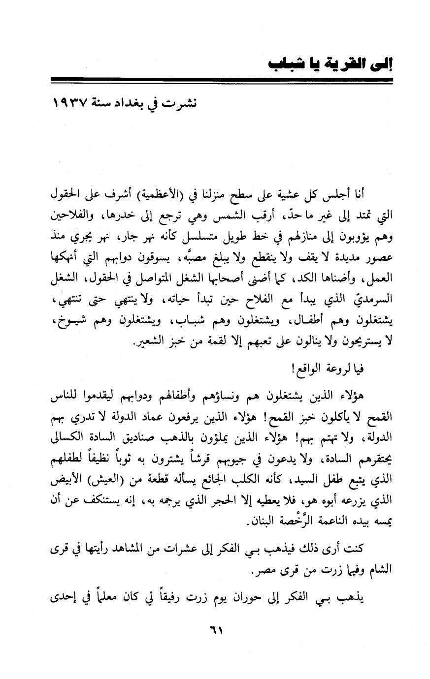 أنا أجلس كل عشية على سطح منزلنا في (الأعظمية) أشرف على الحقول التي تمتد إلى غير ما حدّ، أرقب الشمس وهي ترجع إلى خدرها، والفلاحين وهم يؤوبون إلى منازلهم في خط طويل متسلسل كأنه نهر جار، نهر يجري منذ عصور مديدة لا يقف ولا ينقطع ولا يبلغ مصبَّه، يسوقون دوابهم التي أنهكها العمل، وأضناها الكد، كما أضنى أصحابها الشغل المتواصل في الحقول، الشغل السرمديّ الذي يبدأ مع الفلاح حين تبدأ حياته، ولا ينتهي حتى تنتهي، يشتغلون وهم أطفال، ويشتغلون وهم شباب، ويشتغلون وهم شيوخ، لا يستريحون ولا ينالون على تعبهم إلا لقمة من خبز الشعير.
