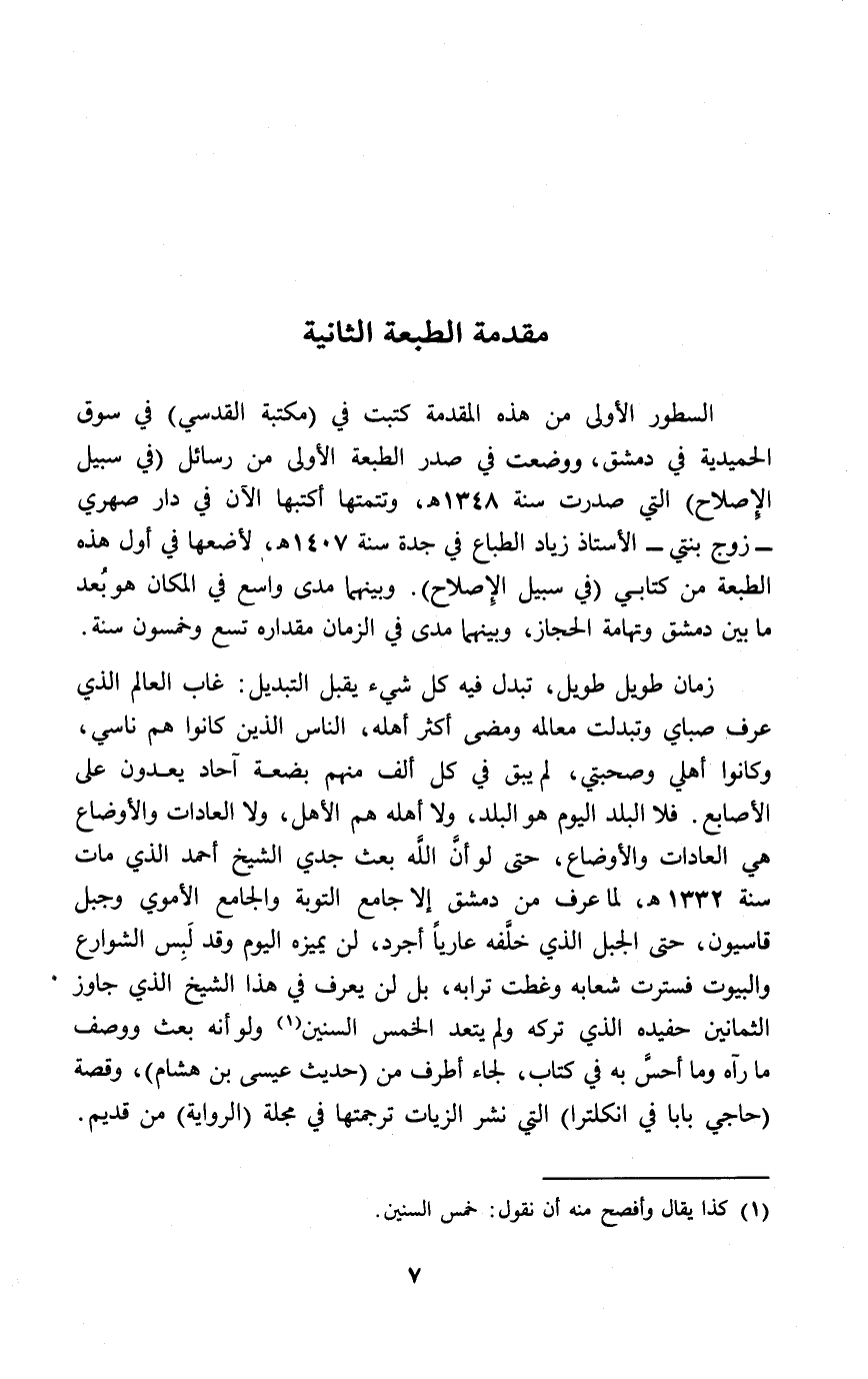 السطور الأولى من هذه المقدمة كتبت في (مكتبة القدسي) في سوق الحميدية في دمشق، ووضعت في صدر الطبعة الأولى من رسائل (في سبيل الإصلاح) التي صدرت سنة 1348هـ، وتتمتها أكتبها الآن في دار صهري -زوج بنتي- الأستاذ زياد الطباع في جدة سنة 1407هـ، لأضعها في أول هذه الطبعة من كتابي (في سبيل الِإصلاح). وبينهما مدى واسع في المكان هو بُعد ما بين دمشق وتهامة الحجاز، وبينهما مدى في الزمان مقداره تسع وخمسون سنة.