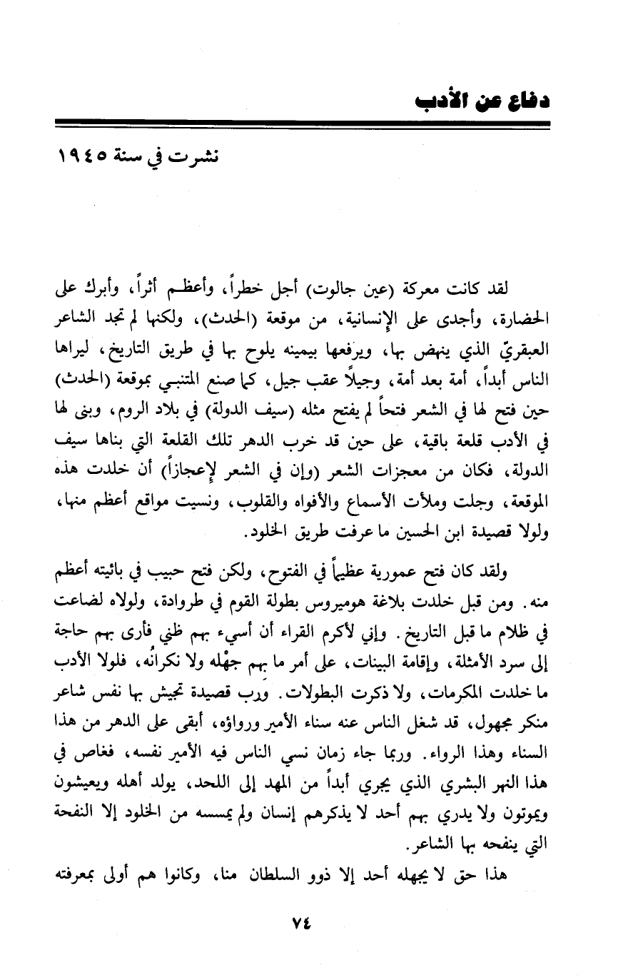 ولقد كان فتح عمورية عظيماً في الفتوح، ولكن فتح حبيب في بائيته أعظم منه. ومن قبل خلدت بلاغة هوميروس بطولة القوم في طروادة، ولولاه لضاعت في ظلام ما قبل التاريخ. وإني لأكرم القراء أن أسيء بهم ظني فأرى بهم حاجة إلى سرد الأمثلة، وإقامة البينات، على أمر ما بِهم جهْله ولا نكرانُه، فلولا الأدب ما خلدت المكرمات، ولا ذكرت البطولات. ورب قصيدة تجيش بها نفس شاعر منكر مجهول، قد شغل الناس عنه سناء الأمير ورواؤه، أبقى على الدهر من هذا السناء وهذا الدواء. وربما جاء زمان نسي الناس فيه الأمير نفسه، فغاص في هذا القهر البشري الذي يجري أبداً من المهد إلى اللحد، يولد أهله ويعيشون ويموتون ولا يدري بهم أحد لا يذكرهم إنسان ولم يمسسه من الخلود إلا النفحة التي ينفحه بها الشاعر.