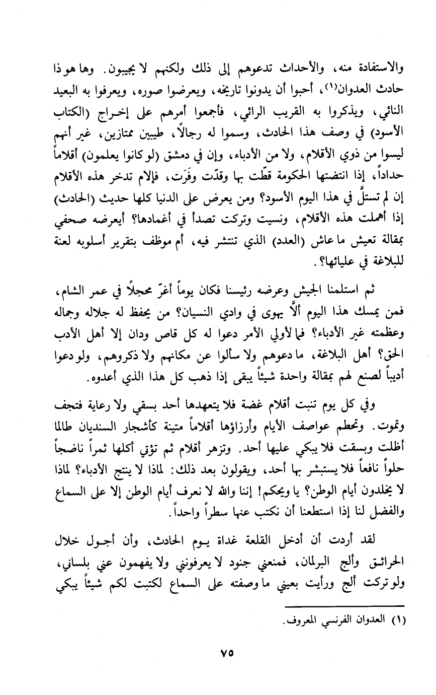 ثم استلمنا الجيش وعرضه رئيسنا فكان يوماً أغرّ محجلاً في عمر الشام، فمن يمسك هذا اليوم ألَّا يهوى في وادي النسيان؟ من يحفظ له جلاله وجماله وعظمته غير الأدباء؟ فما لأولي الأمر دعوا له كل قاص ودان إلا أهل الأدب الحق؟ أهل البلاغة، ما دعوهم ولا سألوا عن مكانهم ولا ذكروهم، ولو دعوا أديباً لصنع لهم بمقالة واحدة شيئاً يبقى إذا ذهب كل هذا الذي أعدوه.