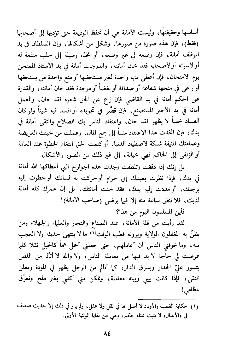 أساسها وحقيقتها، وليست الأمانة هي أن تحفظ الوديعة حتى تؤديها إلى أصحابها (فقط)، فإن هذه صورة من صورها، وشكل من أشكالها، وإن السلطان في يد الموظف أمانة، فإن وضعه في غير وضعه، أو اتخذه وسيلة إلى جلب منفعة له أو لأسرته أو لأصحابه فقد خان أمانته، والدرجات أمانة في يد الأستاذ الممتحن يوم الامتحان، فإن أعطى منها واحدة لغير مستحقيها أو منع واحدة من يستحقها أو راعى في منحها شفاعة أو صداقة أو بغضاً أو موجدة فقد خان أمانته، والقدرة على الحكم أمانة في يد القاضي فإن زاغ عن الحق شعرة فقد خان، والعمل أمانة في يد الأجير المستصنع، فإن قصَّر في تجويده أو أفسد فيه شيئاً ولو كان الفساد خفياً لا يظهر فقد خان، واعتقاد الناس بك الصلاح والتقى أمانة في يدك، فإن اتخذت هذا الاعتقاد سبباً إلى جمع المال، وعملت من لحيتك العريضة وعمامتك المنيفة شبكة لاصطياد الدنيا، أو كتمت الحق ابتغاء الحظوة عند العامة أو الزلفى إلى الحاكم فهي خيانة، إلى غير ذلك من الصور والأشكال.