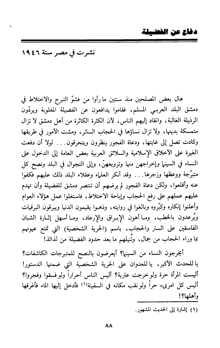 هال بعض المصلحين منذ سنتين ما رأوا من فشوّ التبرج والاختلاط في دمشق البلد العربي المسلم، فقاموا يدافعون عن الفضيلة المغلوبة ويردّون الرذيلة الغالبة، وانقاد إليهم الناس، لأن الكثرة الكاثرة من أهل دمشق لا تزال متمسكة بدينها، ولا تزال نساؤها في الحجاب الساتر، ومشت الأمور في طريقها وكادت تصل إلى غايتها، ودعاة الفجور ينظرون ويتحرقون ... لولا أن دفعت الغيرة على الأخلاق الإسلامية والسلائق العربية بعض العامة إلى الدخول على النساء في السينما وإخراجهن منها وترويعهنّ، وإلى التجوال في البلد ونصح كل متبرّجة ووعظها وزجرها ... وقد أنكر العلماء وعقلاء البلد ذلك عليهم فكفوا عنه وأقلعوا، ولكن دعاة الفجور لم يرضهم أن تنتصر دمشق للفضيلة وأن تهدم عليهم عملهم على رفع الحجاب وإباحة الاختلاط، فاستغلوا عمل هؤلاء العوام وأعلنوا إنكاره وكّبروه وبالغوا في روايته، وذهبوا يقيمون الدنيا ويبرقون البرقيات ويُرعدون بالخطب، وما أهون الإبراق والإرعاد، وما أسهل إثارة الشبان الفاسقين على الستر والحجاب، باسم (الحرية الشخصية) التي تمتع عيونهم بما وراء الحجاب من جمال، وتُنيلهم ما بعد حدود الفضيلة من لذائذ!