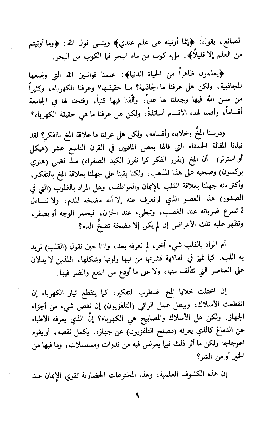 ودرسنا المخَّ وخلاياه وأقسامه، ولكن هل عرفنا ما علاقة المخ بالفكر؟ لقد نبذنا المقالة الحمقاء التي قالها بعض الماديين في القرن التاسع عشر (هيكل أو استرنر): أن المخ (يفرز الفكر كما تفرز الكبد الصفراء) منذ قضى (هنري بركسون) وصحبه على هذا المذهب، ولكنا بقينا على جهلنا بعلاقة المخ بالتفكير، وأكثر منه جهلنا بعلاقة القلب بالإيمان والعواطف، وهل المراد بالقلوب (التي في الصدور) هذا العضو الذي لم نعرف عنه إلا أنه مضخة للدم، ولا نتساءل لم تسرع ضرباته عند الغضب، وتبطيء عند الحزن، فيحمر الوجه أو يصفر، وتظهر عليه تلك الأعراض إن لم يكن إلا مضخة تضخُّ الدم؟