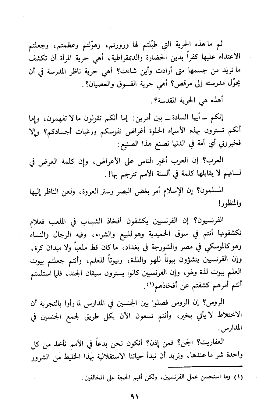 إنكم -أيها السادة- بين أمرين: إما أنكم تقولون ما لا تفهمون، وإما أنكم تسترون بهذه الأسماء الحلوة أغراض نفوسكم ورغبات أجسادكم؟ وإلا فخبروني أي أمة في الدنيا تصنع هذا الصنيع: