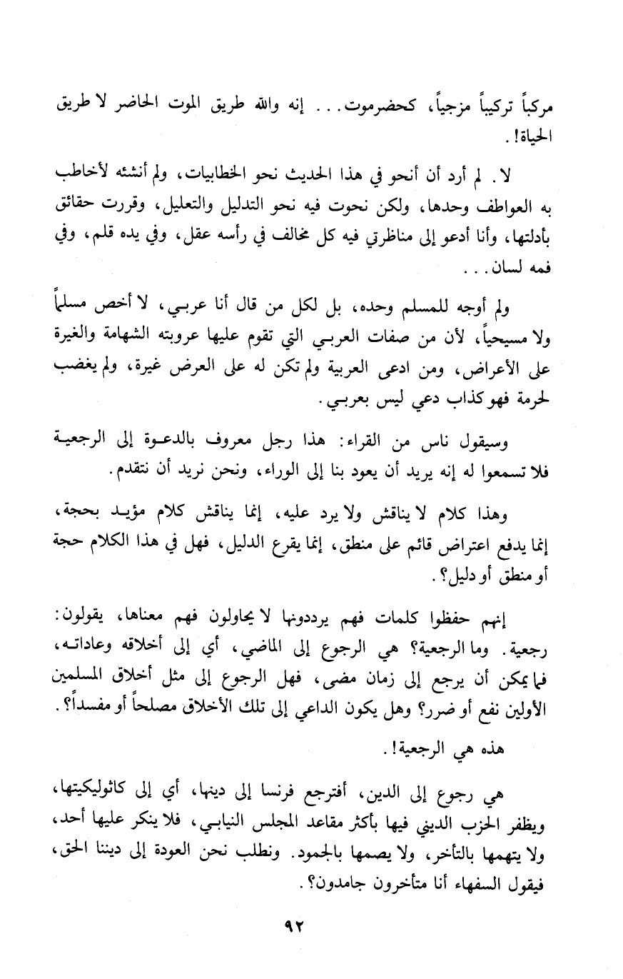 هي رجوع إلى الدين، أفترجع فرنسا إلى دينها، أي إلى كاثوليكيتها، ويظفر الحزب الديني فيها بارز مقاعد المجلس النيابي، فلا ينكر عليها أحد، ولا يتهمها بالتأخر، ولا يصمها بالجمود. ونطلب نحن العودة إلى ديننا الحق، فيقول السفهاء أنا متأخرون جامدون؟.