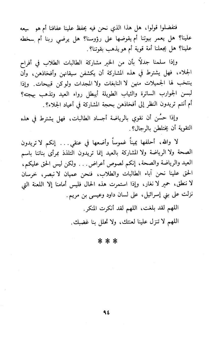 لا والله، أحلفها يميناً غموساً وأضعها في عنقي ... إنكم لا تريدون الصحة ولا الرياضة ولا المشاركة بالعيد إنما تريدون التلذذ بمرأى بناتنا باسم العيد والرياضة والصحة، إنكم لصوص أعراض ... ولكن ليس الحق عليكم، الحق علينا نحن آباء الطالبات والطلاب، فنحن عميان لا نبصر، خرسان لا ننطق، حمير لا نغار، وإذا استمرت هذه الحال فليس أمامنا إلا اللعنة التي نزلت على بني إسرائيل، على لسان داود وعيسى بن مريم.