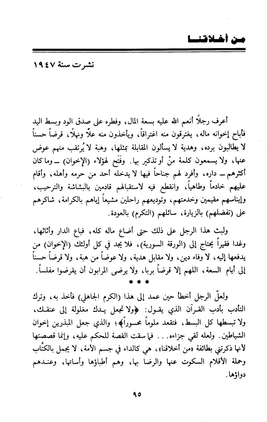 ولعلّ الرجل أخطأ حين عمد إلى هذا (الكرم الجاهلي) فأخذ به، وترك التأدب بأدب القرآن الذي يقول: {وَلَا تَجْعَلْ يَدَكَ مَغْلُولَةً إِلَى عُنُقِكَ وَلَا تَبْسُطْهَا كُلَّ الْبَسْطِ فَتَقْعُدَ مَلُومًا مَحْسُورًا}؛ والذي جعل المبذرين إخوان الشياطين. ولعله لقي جزاءه ... فما سقت القصة للحكم عليه، وإنما قصصتها لأنها ذكرتني بطائفة «من أخلاقنا»، هي كالداء في جسم الأمة، لا يجمل بالكتَّاب وحملة الأقلام السكوت عنها والرضا بها، وهم أطباؤها وأساتها، وعندهم دواؤها.