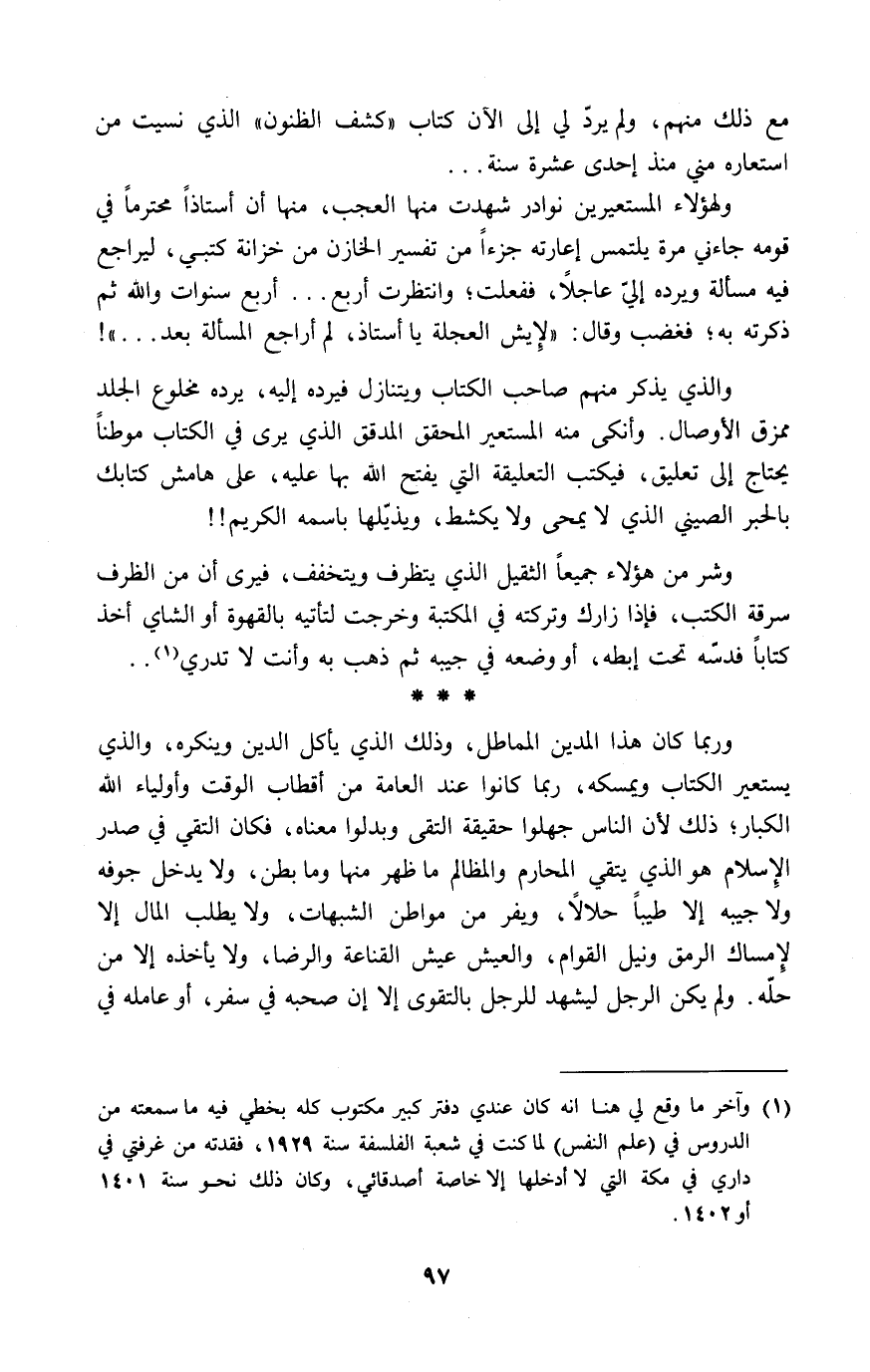 (¬1) وآخر ما وقع لي هنا انه كان عندي دفتر كبير مكتوب كله بخطي فيه ما سمعته من الدروس في (علم النفس) لما كنت في شعبة الفلسفة سنة 1929، فقدته من غرفتي في داري في مكة التي لا أدخلها إلا خاصة أصدقائي، وكان ذلك نحو سنة 1401 أو 1402.