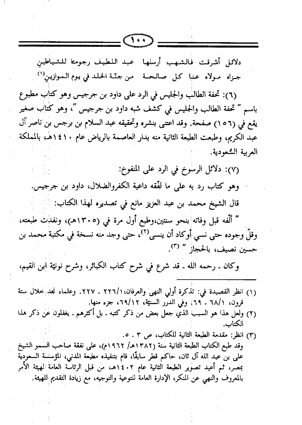 (6) : تحفة الطالب والجليس في الرد على داود بن جرجيس وهو كتاب مطبوع باسم "تحفة الطالب والجليس في كشف شبه داود بن جرجيس"، وهو كتاب صغير يقع في (156) صفحة. وقد اعتنى بنشره وتحقيقه عبد السلام بن برجس بن ناصر آل عبد الكريم، وطبعت الطبعة الثانية منه بدار العاصمة بالرياض عام 1410هـ، بالمملكة العربية السعودية.