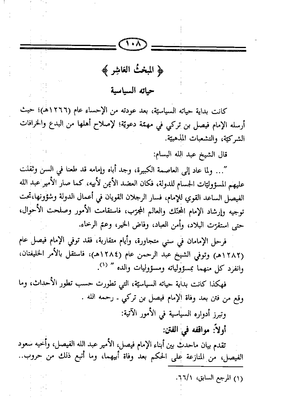 فهكذا كانت بداية حياته السياسية، التي تطورت حسب تطور الأحداث، وما وقع من فتن بعد وفاة الإمام فيصل بن تركي -رحمه الله-.