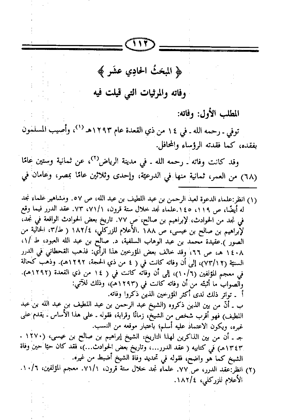 (1) انظر: علماء الدعوة لعبد الرحمن بن عبد اللطيف بن عبد الله، ص57. ومشاهير علماء نجد له أيضاً، ص119، 145. علماء نجد خلال ستة قرون، 1/71، 73. عقد الدرر فيما وقع في نجد من الحوادث، لإبراهيم بن صالح، ص77. تاريخ بعض الحوادث الواقعة في نجد، لإبراهيم بن صالح بن عيسى، ص188. الأعلام للزركلي، 4/182 (ط/3، الخالية من الصور) . عقيدة محمد بن عبد الوهاب السلفية، د. صالح بن عبد العبود، ط/1، 1408هـ، ص66، وقد خالف بعض المؤرخين هذا الرأي: فذهب القحطاني في الدرر السنية (12/73) ، إلى أن وفاته كانت في (4 من ذي الحجة، 1292هـ) . وذهب كحالة في معجم المؤلفين (6/10) ، إلى أن وفاته كانت في (14 من ذي القعدة (1292هـ) .