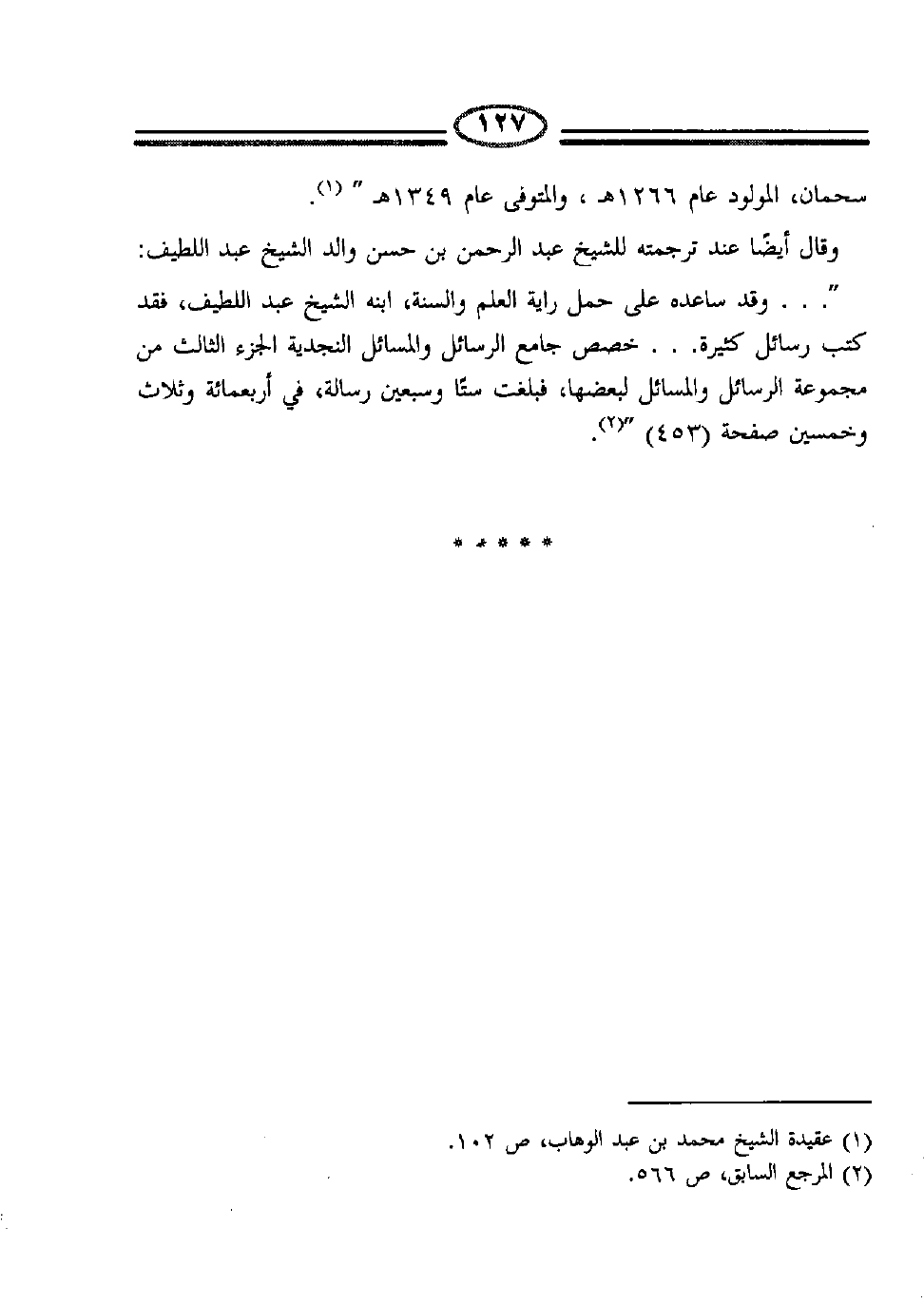 وقال أيضاً عند ترجمته للشيخ عبد الرحمن بن حسن والد الشيخ عبد اللطيف: "… وقد ساعده على حمل راية العلم والسنة، ابنه الشيخ عبد اللطيف، فقد كتب رسائل كثيرة … خصص جامع الرسائل والمسائل النجدية الجزء الثالث من مجموعة الرسائل والمسائل لبعضها، فبلغت ستاً وسبعين رسالة، في أربعمائة وثلاث وخمسين صفحة (453) " (2) .