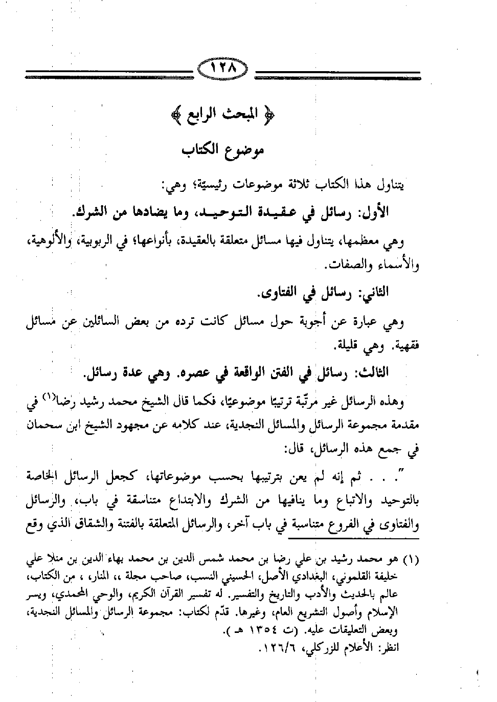 (1) هو محمد رشيد بن علي رضا بن محمد شمس الدين بن محمد بهاء الدين بن منلا علي خليفة القلموني، البغدادي الأصل، الحسيني النسب، صاحب مجلة، المنار، من الكتاب، عالم بالحديث والأدب والتاريخ والتفسير. له تفسير القرآن الكريم، والوحي المحمدي، ويسر الإسلام وأصول التشريع العام، وغيرها. قدم لكتاب: مجموعة الرسائل والمسائل النجدية، وبعض التعليقات عليه. (ت 1354هـ) .