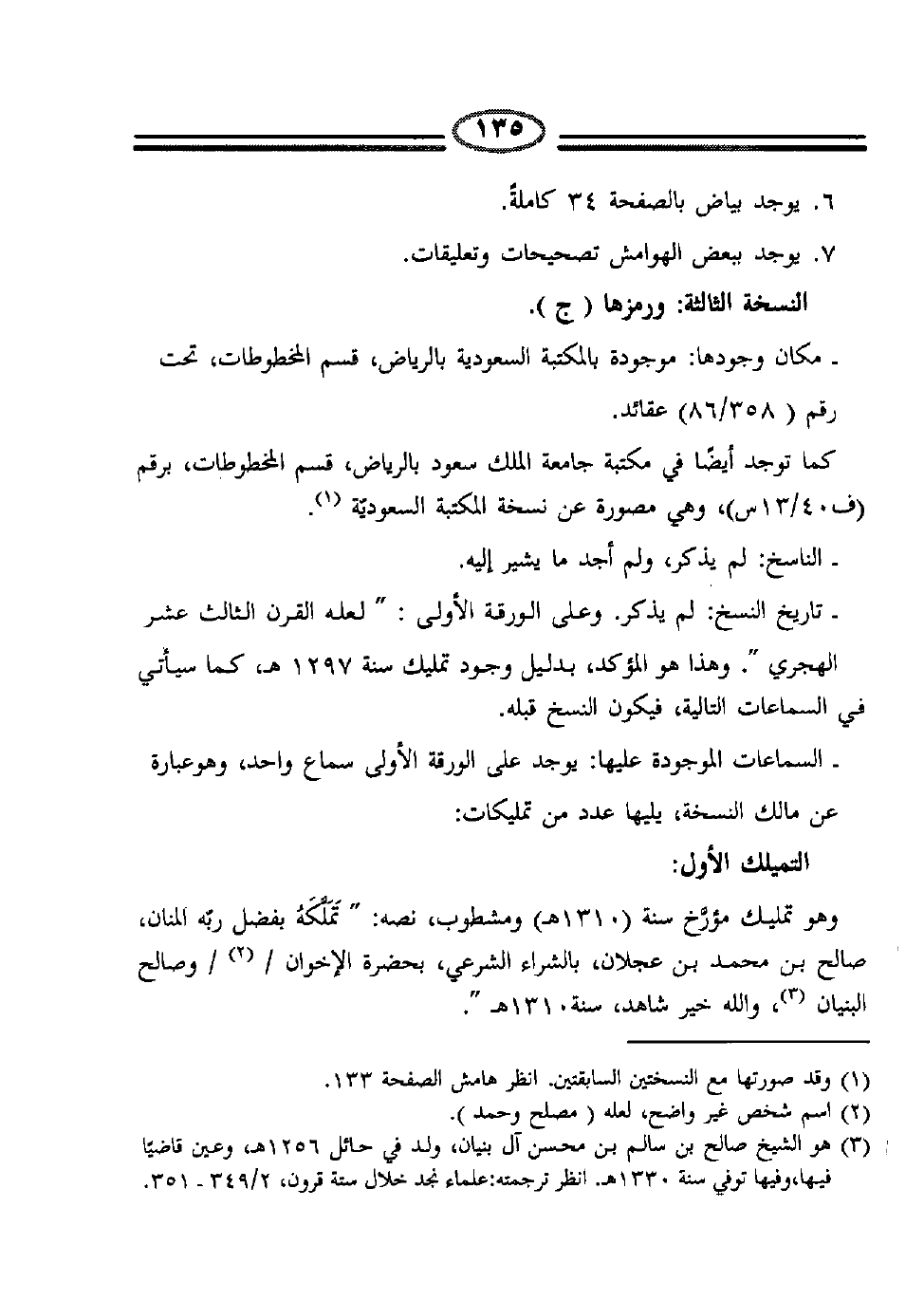 (3) هو الشيخ صالح بن سالم بن محسن آل بنيان، ولد في حائل 1256هـ، وعين قاضياً فيها، وفيها توفي سنة 1330هـ. انظر ترجمته: علماء نجد خلال ستة قرون، 2/349-351.